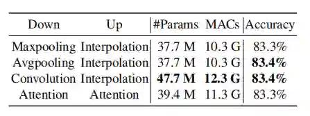 上表展示了不同的上/下采样策略,包括max-pooling、mean-pooling、卷积和基于注意力采样的结果。