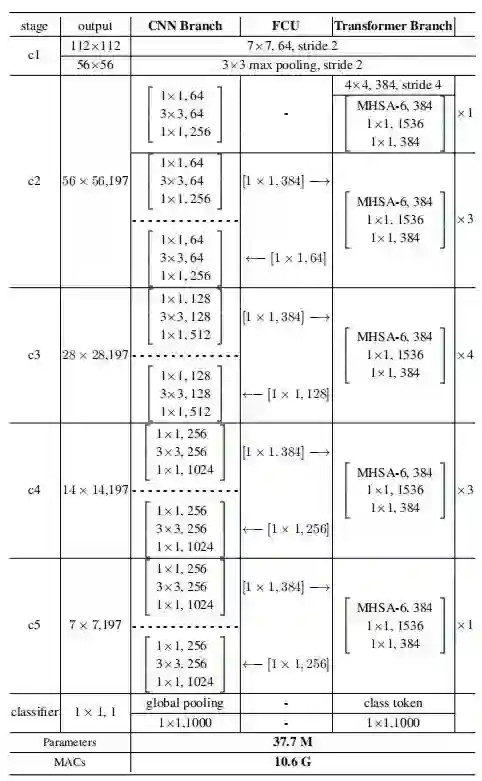 如上图(b)所示,CNN分支采用特征金字塔结构,其中特征图的分辨率随着网络深度的增加而降低,而通道数随着网络深度的增加而增加。作者将整个CNN分支分为4个阶段(如上表所示)。每个阶段由多个卷积块组成,每个卷积块包含 个bottleneck。在实验中, 在第一个卷积块中被设置为1,并在随后的N−1卷积块中设置为 。