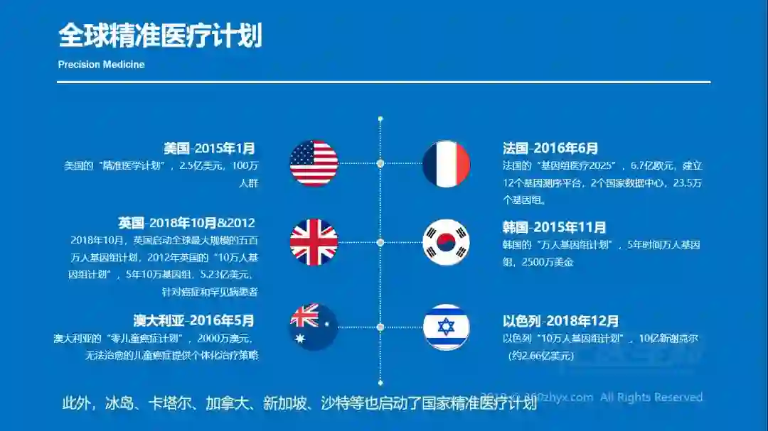 美国之后,包括我国在内的许多国家也都陆续开始了自己的国民级基因组计划,例如下图中列出的法国、韩国、英国等。