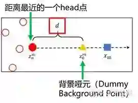 在实验中我们注意到,上述方案中的目标后验概率可以较为准确推断出人(Head Point)与人(Head Point)之间的边界,但是对于远离任何人头标注(Head Point)的位置,却不太理想。这些位置很可能是背景点,然而通过计算却有一定概率会得到一个较高的后验概率。为了解决这个问题,并且保证在背景区域的后验概率场计算准确性,我们将背景类也当成一个特殊的目标(类) ,并且引入一个动态的背景哑元(Dummy Background Point)。利用背景哑元,我们可以“吸收”远离人群的背景区域像素的“贡献”,从而更为准确的计算背景区域的似然及最终的后验概率。