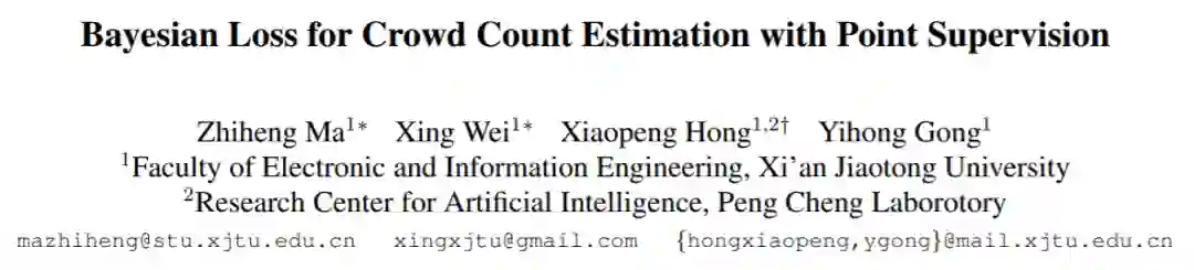 @inproceedings{ma2019bayesian, title={Bayesian loss for crowd count estimation with point supervision}, author={Ma, Zhiheng and Wei, Xing and Hong, Xiaopeng and Gong, Yihong}, booktitle={Proceedings of the IEEE International Conference on Computer Vision}, pages={6142--6151}, year={2019} }