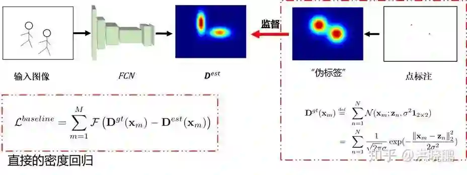 现有的基于目标检测的目标计数方法无法有效地检测稠密区域中的每一个目标,因此在精确计数方面存在着很大的困难。尽管最近使用卷积神经网络(CNN)的目标计数方法取得了显着进展,但正如图1所示,传统方法在训练时通常需要从提供的输入图像“点”标注“生成”真值(Ground Truth)密度图,并以其作为监督信号,与模型预测得到的密度图一起用来计算相应的损失(Loss),进行直接的密度回归估计。从点标注生成真值密度图的过程需要对点标注作简单的高斯假设,进行模糊处理从而生成可用于训练监督的像素级真值概率密度。然而,由于目标之间高度的拥挤与重叠,通过上述方法生成的概率密度仅仅是对实际概率密度图的一个粗略逼近,其准确度是很难保证的。此外,由于目标大小信息往往无法获得,因此在对每个标注点高斯假设时无法准确获得每个目标对应的高斯分布标准差 ,因此只能把不同目标的标准差都“粗暴地”设置为一个固定值,这样又进一步影响了所生成概率密度图的准确程度。因此我们这里将这种通过模糊方式从点标注得到的概率密度图称为“伪”真值标签,这里的形容词“伪”表示其与真正的概率密度图差别较大,难以准确体现实际概率密度图的特点。
