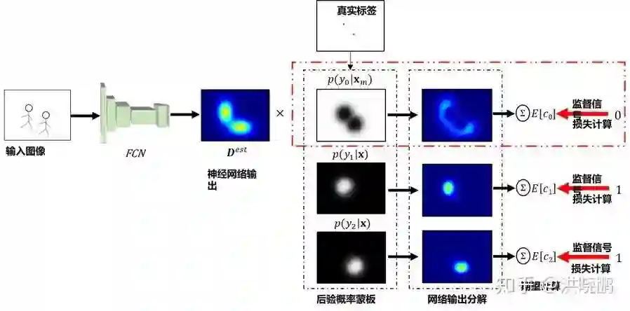 为解决上述这些问题,我们采用了一个全新的思路。我们不再依赖从点标注生成不完美的伪标签,而是直接采用数据库所提供的点标注作为(弱)监督信号。为了使监督信号格式匹配,我们从估计得到的概率密度图的基础上又多进行了一步“期望”操作,利用“离散”的概率密度期望值与“离散”的点标注设计损失函数并进行期望值意义上的回归估计,如下图所示。我们将所提损失函数称为贝叶斯损失函数(Bayesian Loss)。