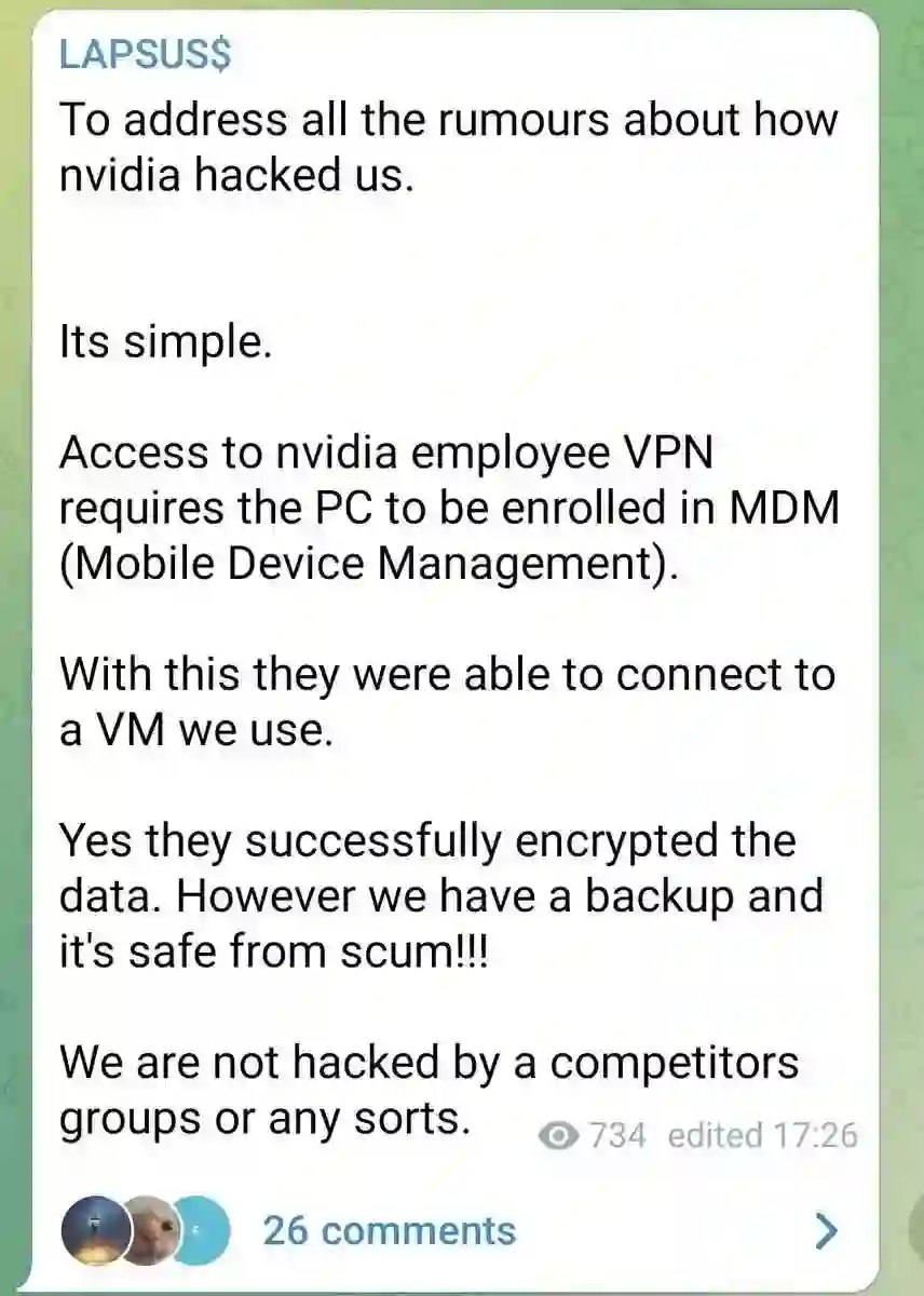 显然,英伟达作为行业的老大可不是吃素的,随即就对Lapsus$来一波报复性打击。