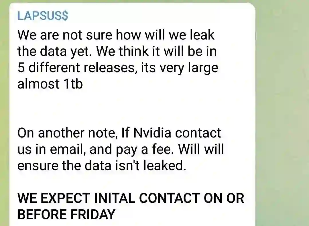 Lapsus$称如果英伟达及早联系他们、老实给钱,事情就可善罢,数据不会有更多泄露。如果不就范的话,就将分五次公布所有数据。