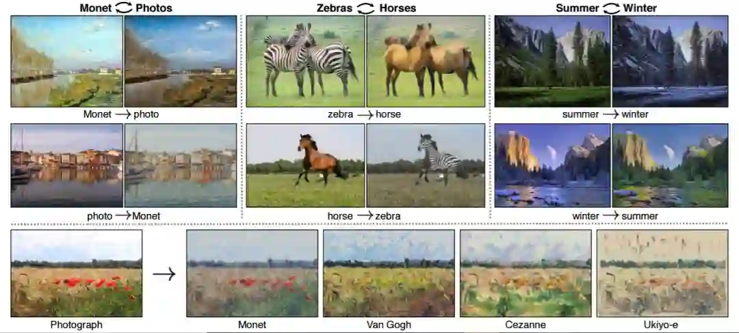 在第三部分中,作者结合他在早期研究中获得的经验,开发了一套新型图像到图像的转换算法。其中非常重要的是 CycleGAN 框架(ICCV 2017),它变革了基于图像的计算机图形学,可作为一种通用框架将一组图像中的视觉风格迁移到其它图像。例如,将夏天转化为冬天、将马转换为斑马及利用计算机图形渲染生成真实图像等。