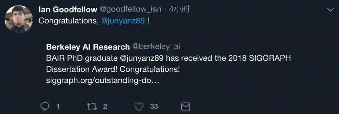 朱俊彦此前也获得了多个学术奖项,仅在 2018 年,他就获得了 UC Berkeley 颁发的 David J. Sakrison Memorial Prize,以及英伟达的 Pioneer Research Award。
