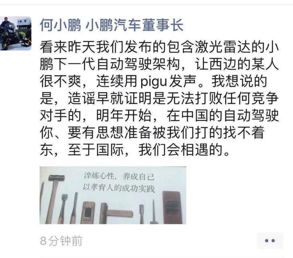 【疑似回应马斯克抄袭指责 何小鹏:造谣无法打败任何竞争对手】11月21日上午,小鹏汽车CEO何小鹏发布微博,疑似隔空回应马斯克指小鹏偷窃技术。他称:“看来昨天我们发布的包含激光雷达的小鹏下一代自动驾驶架构,让西边的某人很不爽,连续用pigu发声。我想说的是,造谣早就证明是无法打败任何竞争对手的。明年开始,在中国的自动驾驶你要有思想准备被我们打得找不着东,至于国际,我们会相遇的。”