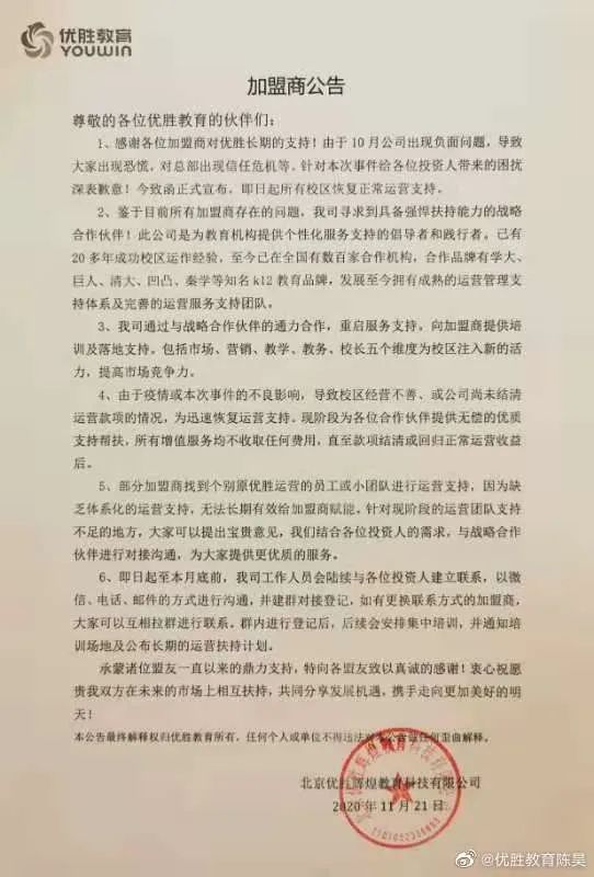 【优胜教育CEO陈昊:即日起所有校区恢复正常运营支持】21日晚间,优胜教育CEO陈昊在其个人微博发布加盟商公告称,即日起所有校区恢复正常运营支持,“现阶段为各位合作伙伴提供无偿的优质支持帮扶,所有增值服务均不收取任何费用,直至款项结清或回归正常运营收益后。”