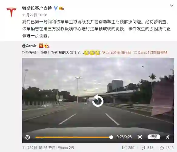 【特斯拉行驶途中天窗掉落?官方回应:车辆曾更换车顶玻璃】针对“行驶中的特斯拉天窗掉落”一事,@特斯拉客户支持 在微博回复网友称,特斯拉已第一时间和该车车主取得联系并在帮助车主尽快解决问题。经初步调查,该车辆曾在第三方授权钣喷中心进行过车顶玻璃的更换,特斯拉方面正在对事件发生的原因做进一步调查。