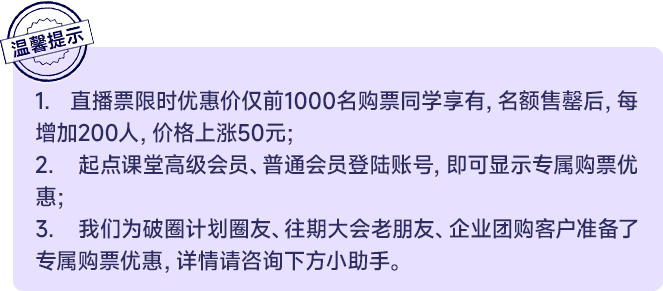 现在购买,即可收看今明2天的直播!所有专场内容的回放有效期为1年,随时随地满足你的学习需要!