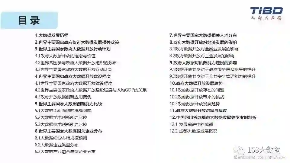报告对大数据发展历程,世界主要国家政府促进大数据发展相关政策、政府大数据开放行动计划、政府大数据开放建设程度,世界主要国家大数据创新能力、大数据相关企业分布、大数据相关人才分布进行了深度的比较分析,阐述了政府大数据开放对经济发展的影响、政府大数据对执政能力建设的影响、政府大数据开放发展趋势及对策建议等,并对中国四川省成都市大数据发展进行了典型案例剖析。