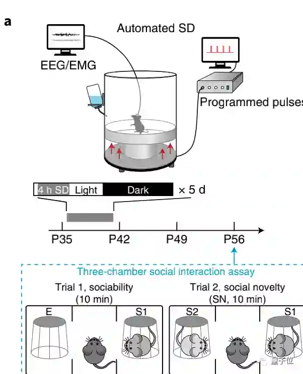 对于第三个SD组的小鼠,研究人员在其成年阶段(出生后第84至91天),进行了睡眠干扰。