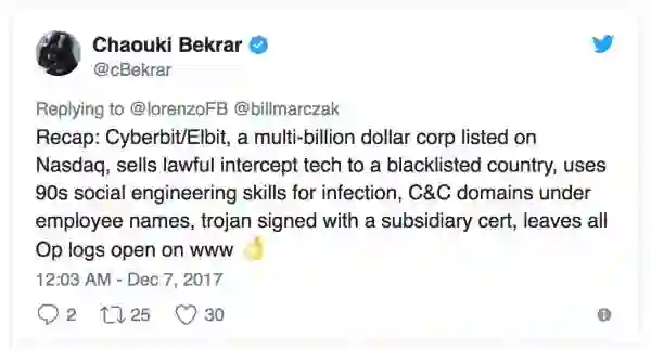 这些攻击中使用的恶意软件是一个名为 PC Surveillance System ( PSS ) 的 Windows 程序,由 Cyberbit 出售,并且 Cyberbit 有意将 PSS 作为合法的监控软件销售给全球的情报与执法机构。据悉,Cyberbit 是 Elbit Systems 的子公司,目前还有其他三家“安全”公司加入了 Elbit Systems,分别是 HackingTeam(产品:RCS – 远程控制系统),Gamma 集团(产品:FinSpy)和 NSO 集团(多个产品),这些公司的产品都是作为专制政权的首选网络工具。