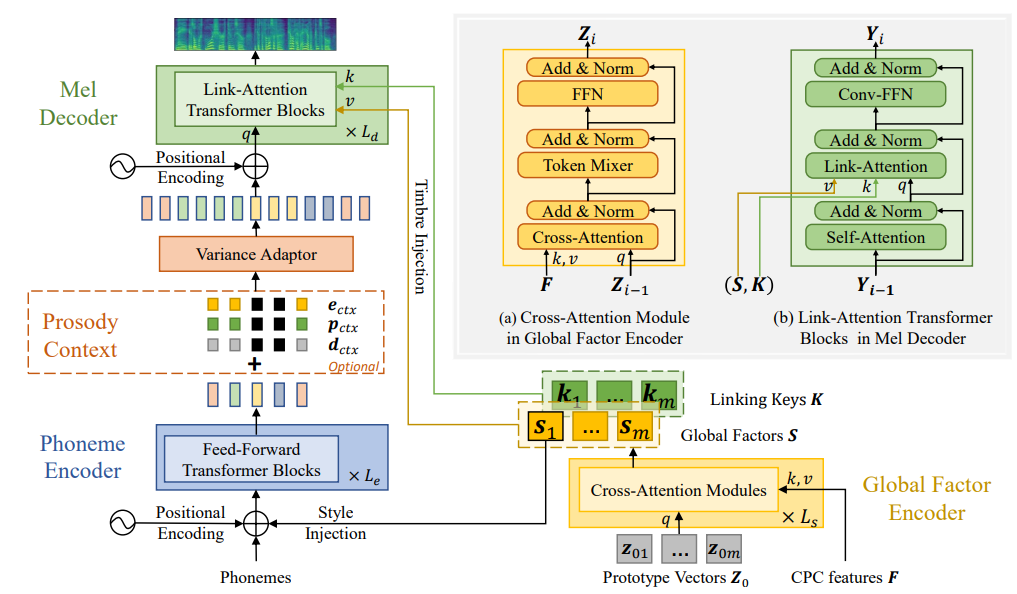研究员们使用 Fastpitch[1] 作为语音合成的主干网络。为了准确地以零样本的方式适应到任意说话者的音色,全局要素与局域要素之间的解耦应足够精准,全局要素的表征需足够完备且应泛化至任意说话人。研究员们在 ICLR 2022 发表的论文“Retriever: Learning Content-Style Representation as a Token-Level Bipartite Graph”[2] 中,已经在很大程度上解决了这一问题,并在零样本语音风格转换任务中取得了最先进的性能。在此,研究员们将“Retriever”中的全局要素建模方法引入到了语音插入任务中。