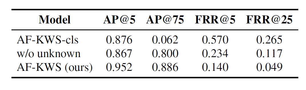 为了验证 AF-KWS 方法的提升不是因为 backbone 更强大,研究员们将三个预测模块替换成了一个分类模块(AF-KWS-cls),发现模型性能明显下降。为了验证引入的“unknown”类别的有效性,研究员们去掉了这个类别(w/o unknown),发现模型性能也明显下降。