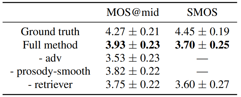 在表2的消融实验中,研究员们分别去掉了对抗训练(- adv),韵律平滑任务(- prosody-smooth),以及 Retriever 的全局要素建模方法 (- retriever),结果均发现明显的性能下降。在三次实验的测试样例中,研究员们分别发现了音质差、韵律不连贯以及音色不像的问题。这验证了 RetrieverTTS 三方面设计均达到了设计初衷。