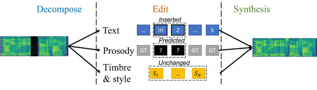 不同于已有方法中将语音插入任务视为文本-语音模态融合的思路 [3,5],如图2所示,研究员们将语音先解耦成文本、韵律(音素序列的音高、音量、时长)、音色、风格四个要素,再在每个要素上进行可控的编辑操作,最后将四部分合成为插入后的语音。一言以蔽之,即“先解耦再编辑”。