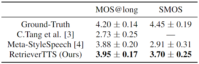 在表3中,研究员们与其他方法进行了对比,发现基于模态融合的方法[3]在插入较长语音的情形下语音自然度表现较差,而其他的零样本说话人自适应语音合成(zero-shot speaker adaptive TTS)[4] 在音色相似度方面与 RetrieverTTS 的方法有较大差距。上述对比体现出了 RetrieverTTS 方法的优越性。