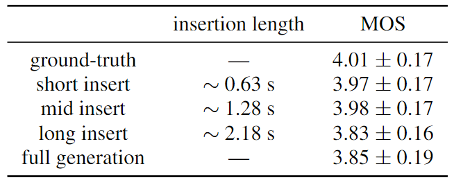 如表1所示,RetrieverTTS 的语音插入效果对插入长度并不敏感。对于训练中没见过的说话人,即使插入语音长度超过两秒乃至生成一整句(long insert, full generation),其语音自然度仍然保持在较高水平。在插入少于6个词时 (short insert, mid insert),甚至达到与真人录音相近的自然度评分。