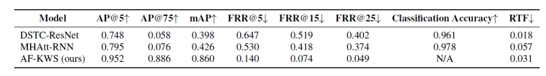 研究员们选用了两个先进的关键词检测模型[10][11]做对比,在连续语音关键词检测的实验设定中,AF-KWS 的模型在可比的运行速度下,平均准确率远超其他模型。