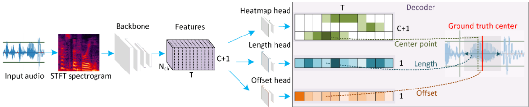 如图4所示,对于输入语音,研究员们首先提取了语音的 STFT 频谱图,然后使用 ResNet[9] 进一步提取特征,然后将特征输入三个预测模块,分别用于预测关键词的热力图、关键词的长度和关键词位置偏置。在训练阶段,热力图以关键词的位置为中心,使用高斯核函数将关键词的位置扩展。在预测阶段,研究员们取预测得到的热力图的峰值点作为预测得到的关键词的位置,然后提取对应位置的关键词长度和偏置的预测结果,计算得到最终的关键词的位置和类别。