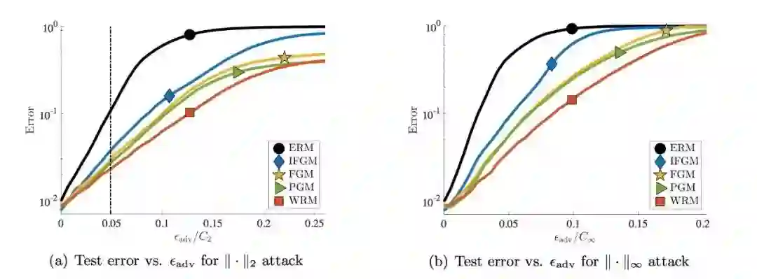 图 3. 对 MNIST 数据集的 PGM 攻击。(a)和(b)分别显示了对于 PGM 攻击在欧氏距离和∞范数下的测试错误分类错误与对抗扰动水平 ǫadv。(a)中的垂直虚线表示用于训练 PGM、FGM 和 IFGM 模型的扰动水平以及估计的半径 pρbn(θWRM)。对于 MNIST,C2=9.21 和 C∞=1.00。