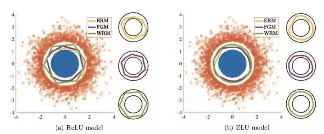 图 1. 合成数据的实验结果。训练数据用蓝色和红色表示。ERM、FGM 和 WRM 的分类边界分别以黄色、紫色和绿色表示。左边为边界与训练数据一起的图示,右边为分开的真实类边界的图示。