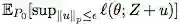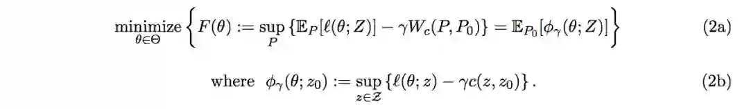 (关于这些等式的严格陈述,请参阅命题 1)。在这里,我们已经用鲁棒性的替代函数 φγ(θ;Z) 代替了通常的损失函数 ℓ(θ;Z)。这个替代函数(2b)允许数据 z 的对抗扰动,由惩罚 γ 调整。我们通常用经验分布 Pbn 代替惩罚问题(2)中的分布 P0 来解决问题,因为 P0 是未知的(我们在下面把这称为惩罚问题)。