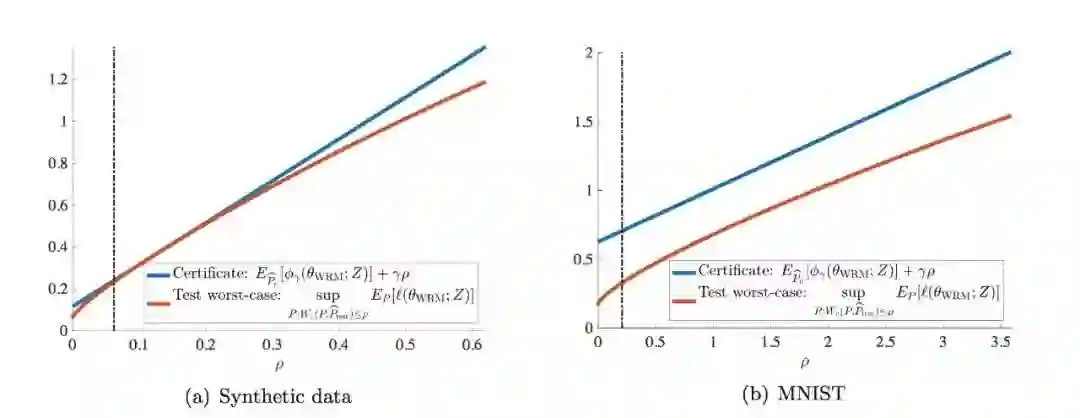 图 2. 用合成数据(a)和 MNIST(b)进行实验的鲁棒性保证(11)(蓝色)和样本外(out-of-sample/测试)最差情况下的性能(红色)之间的经验性比较。在(11)中省略了统计误差项 ǫn(t)。垂直虚线表示在训练集 ρbn(θWRM)上达到的鲁棒性水平。