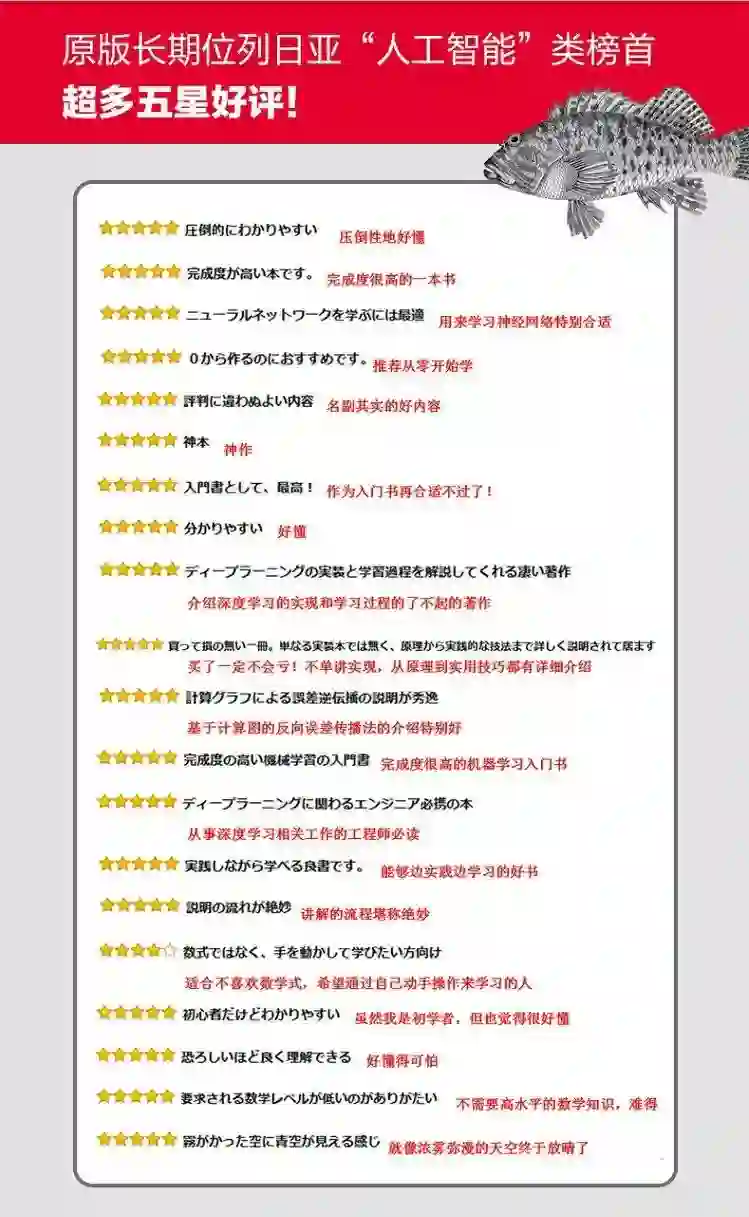 原本书是在日本出版,影响力竟超过了实力派的「花书」,长期在日亚 AI 类图书霸榜。第一次在日亚的网站上看到这本书时,完全被评论吸睛了,评论阵容大概是这样的。