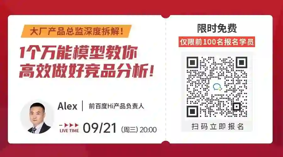 下周三(9月21日)晚上8点,前百度Hi产品负责人@Alex,教你1个万能模型,助你高效做好竞品分析!