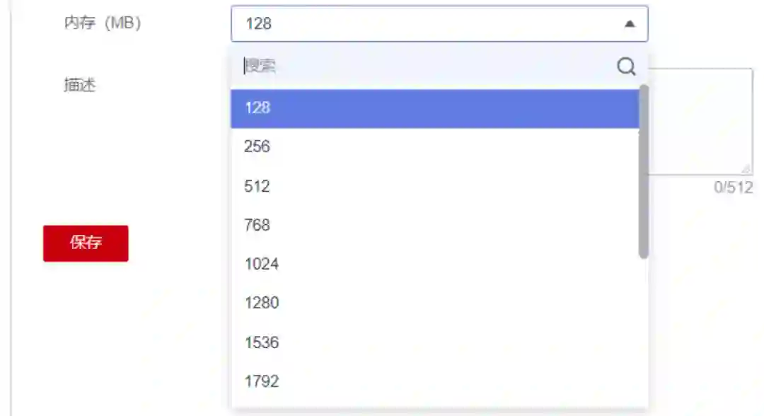 内存规格 (Memory):内存规格也即函数规格、函数实例规格,表示Serverless平台为函数的单个实例所分配的资源大小,一般表示为函数可使用的内存大小,由用户指定;实例可使用的CPU份额与内存大小成正比。Serverless云平台通常提供多种规格供用户选择,以FunctionGraph为例,用户可选15种函数规格,如图1所示。