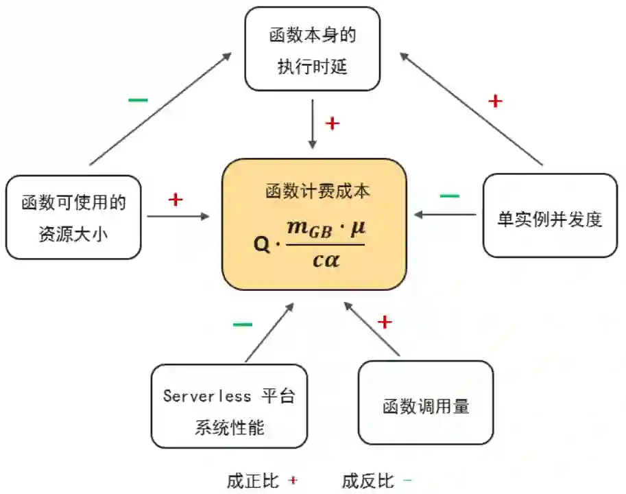 最后,图8对上述几个决定函数成本的关键因素做了一个总结,其中,箭头方向表示元素之间的直接影响,“+”号代表成正比,“-”代表成反比。