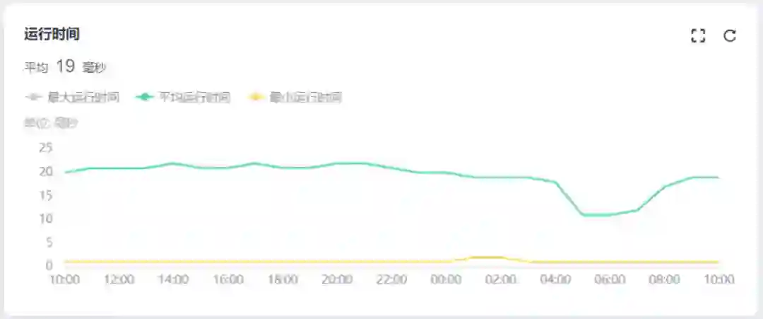 另外,为帮助用户掌握函数运行情况,FunctionGraph为应用函数提供深度可视化的可观测能力,支持丰富的观测指标配置,包括调用次数、错误次数、运行时延等,如图3所示的函数运行时间监控示例。