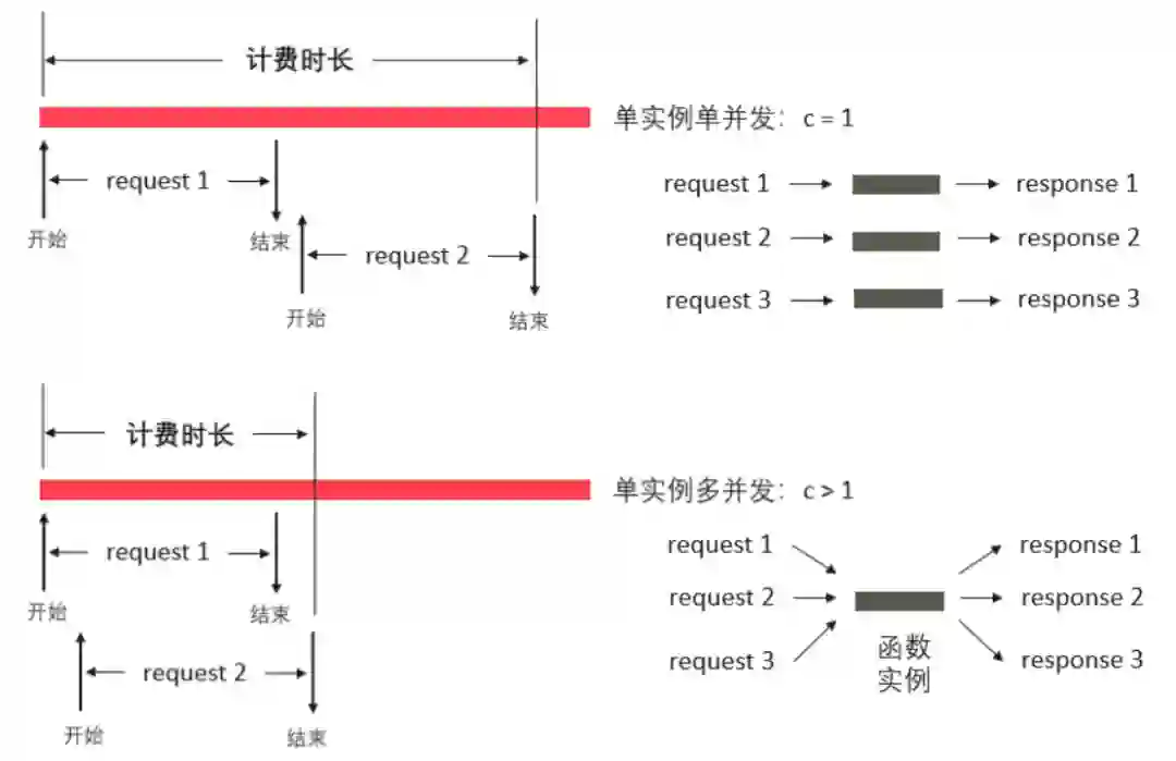 单实例最大并发度 (Maximum Requests per Instance):函数的单个实例可以同时处理的最大请求数,主要适用于函数执行过程中有显著时间在等待下游服务返回的场景,如访问数据库操作或磁盘IO等。对于相同的流量负载,提高函数的单实例并发度可以降低按量实例个数,为用户节省计费,同时,也可以降低函数调用请求的冷启动比例。