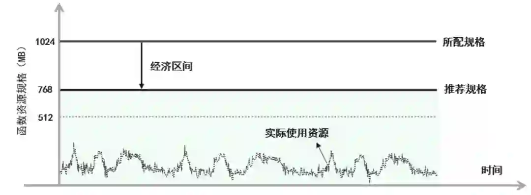 为此,基于内部实践,FunctionGraph 将于近期推出“用户函数成本研究中心 – Cost Analysis and Optimization Center”, 为用户提供包括离线式函数最佳配置调优(offline power tuning)、在线式资源消耗感知与规格动态推荐(online resource recommendation, 如图9所示)、预测性函数弹性预览(predictive auto-scaling preview)等在内的多个重量级特性服务,最大限度降低用户实现函数FinOps的技术门槛,为用户业务开发、Serverless化改造等提供极致便捷性。