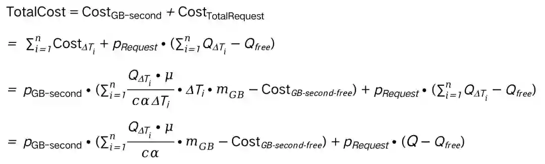在上式中,单实例并发度c和函数规格可以认为在用户配置之后属于常数;α属于平台侧参数,也可视作常数;对于函数执行时延μ,实际中通常会由于冷热启动差异、网络抖动、调用请求入参等的不同而波动,且考虑到Serverless计费是精确到毫秒级别的,因此严格意义上不能被视作为常数。不过,作为估计模型,这里暂且假定μ也为常数。综上,总成本模型可以表示为:
