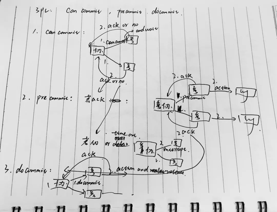 三阶段提交分为三个阶段,分别是cancommit, precommit, docommit.