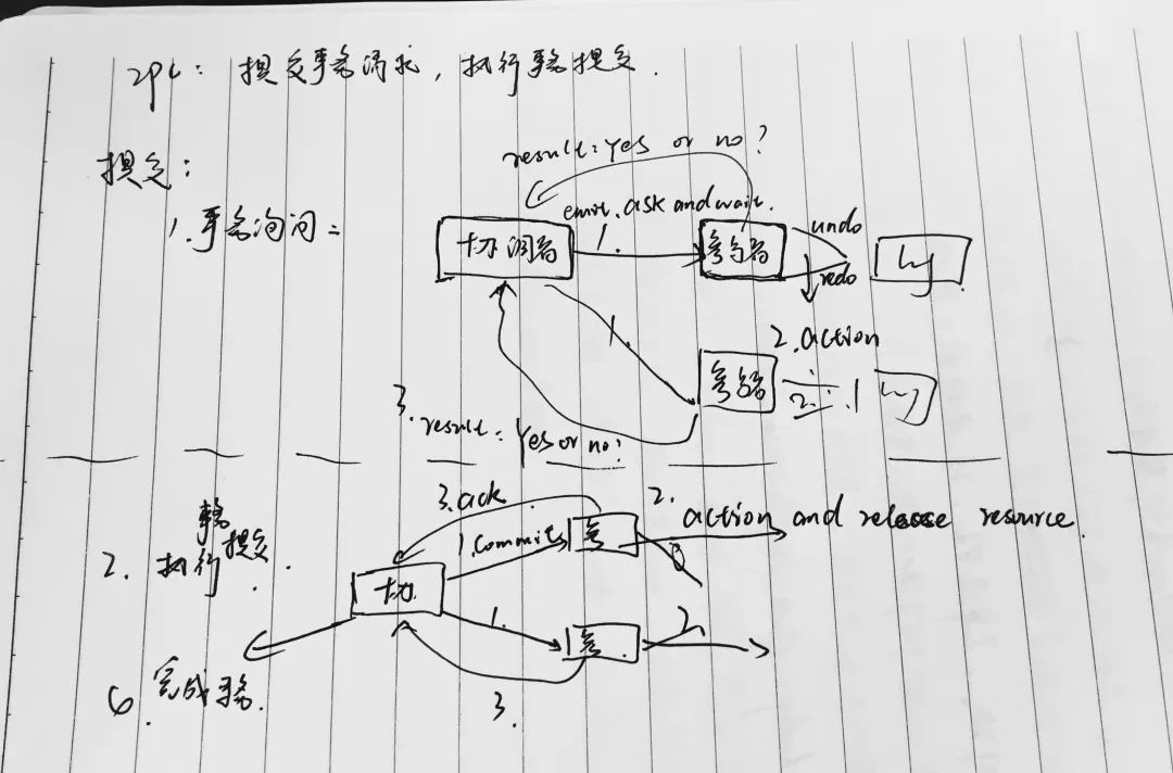 5最后是docommit,如果协调者收到第二阶段的所有参与者的ack请求,则向参与者发送docommit请求,执行事务的提交。参与者收到docommit请求后执行事务的提交,成功后释放事务资源,并向协调者发送ACK反馈。协调者收到所有的参与者反馈后,完成事务的提交。