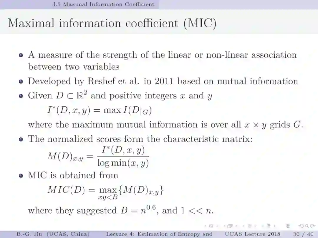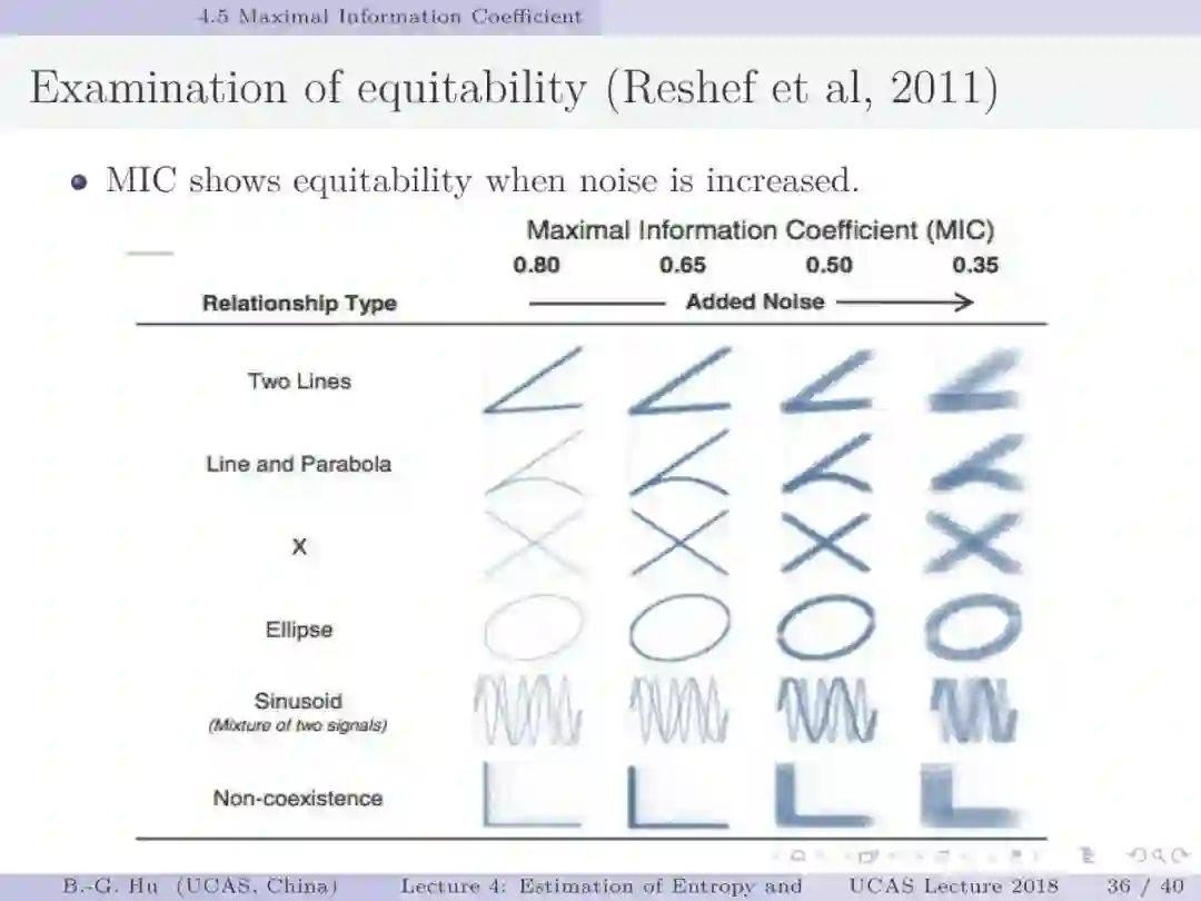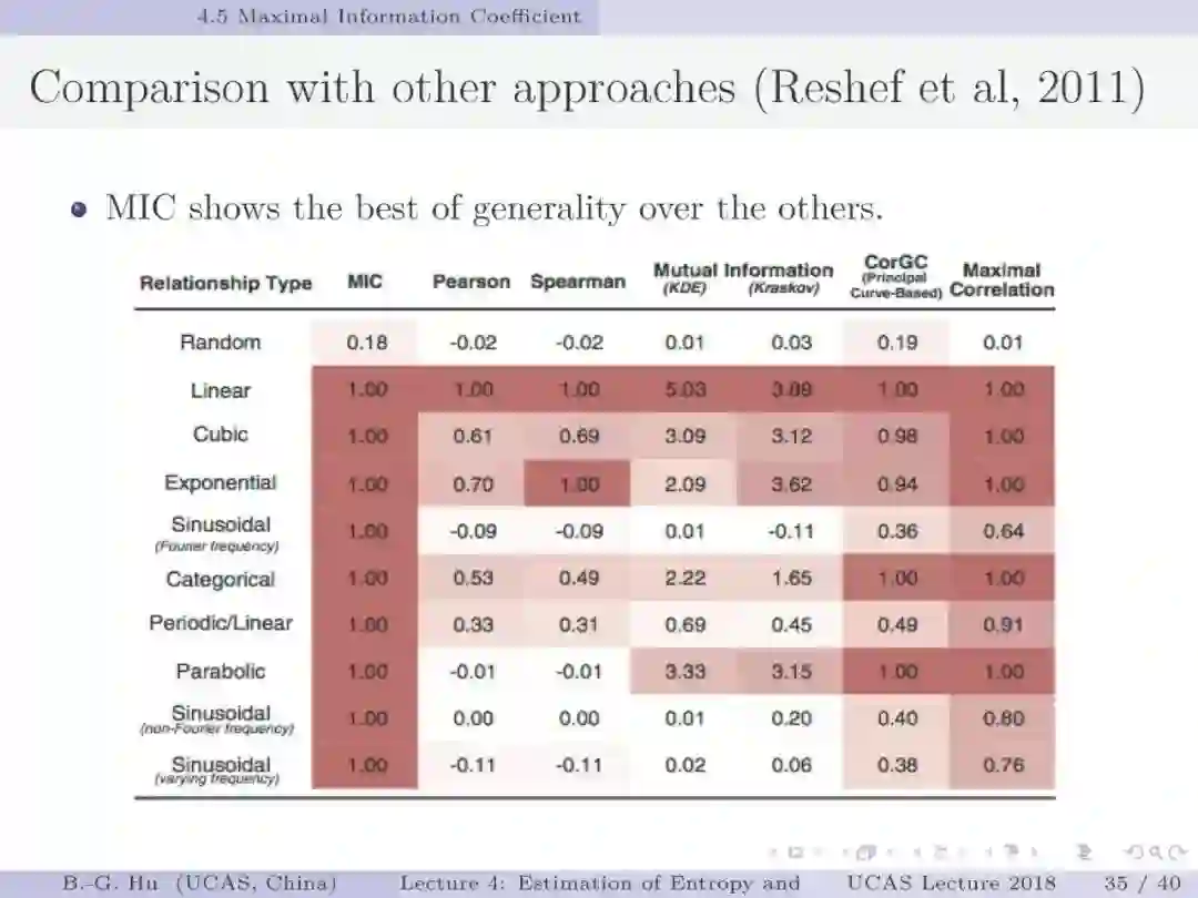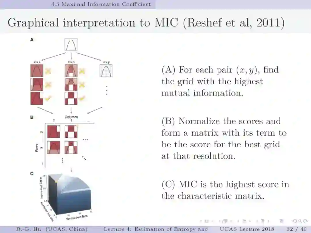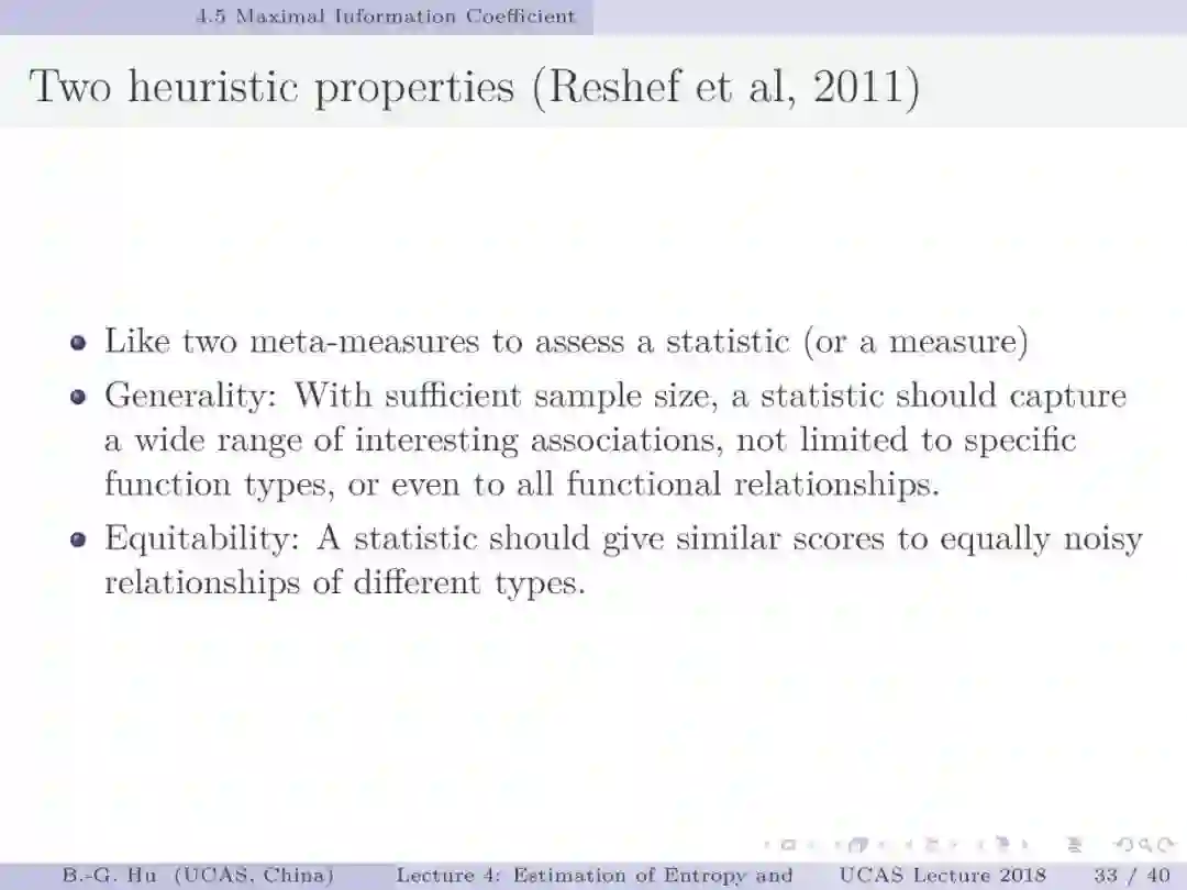 第30-37页: 我认为MIC方法给出了信息论中互信息定义扩展应用与估计方法创新的典型样例。他们首先发现现有指标应用中的问题,然后提出基于信息论为基础思想的指标,再后对这个指标提出需求满足两个启发式属性。这是一种顶层的先验知识。我们将其称为“元准则”,即关于准则之上的准则。最后是发展了具体MIC方法并从数据实验中表明该方法是基本符合两个启发式属性。希望读者能够从从这个研究样例中“悟”出一种个人总结的方法论?