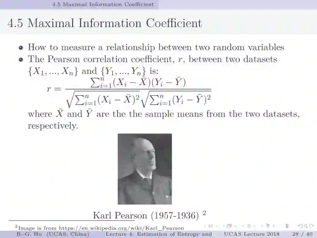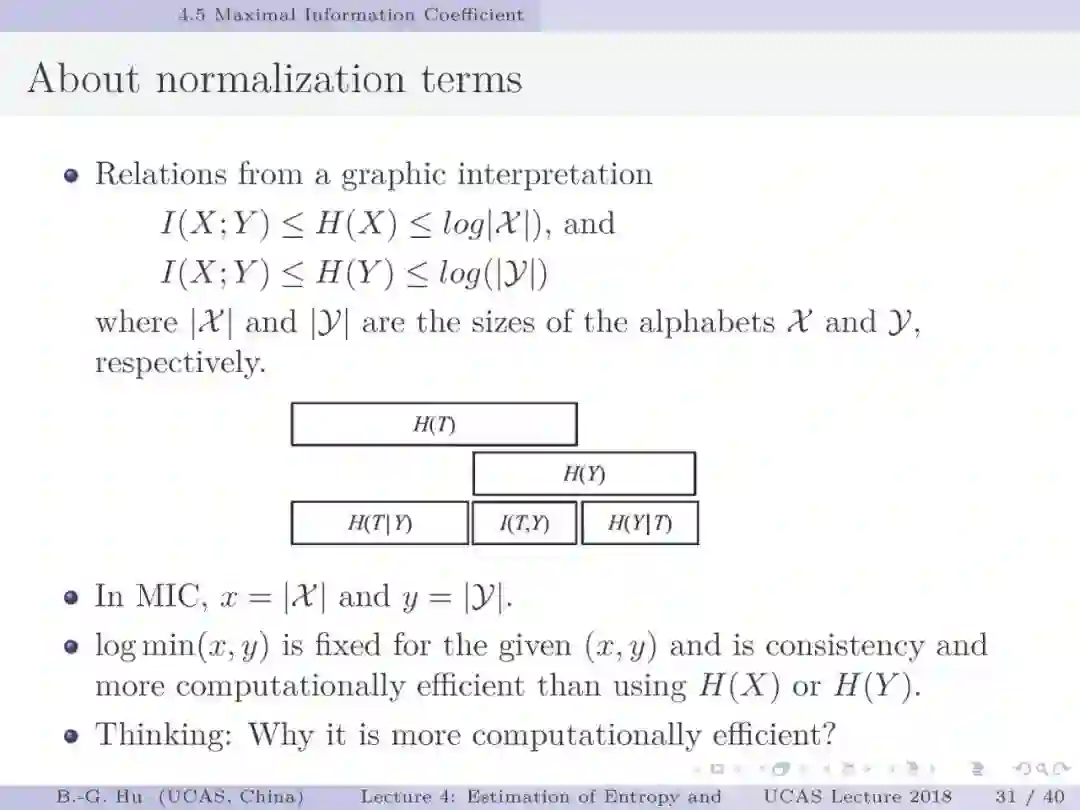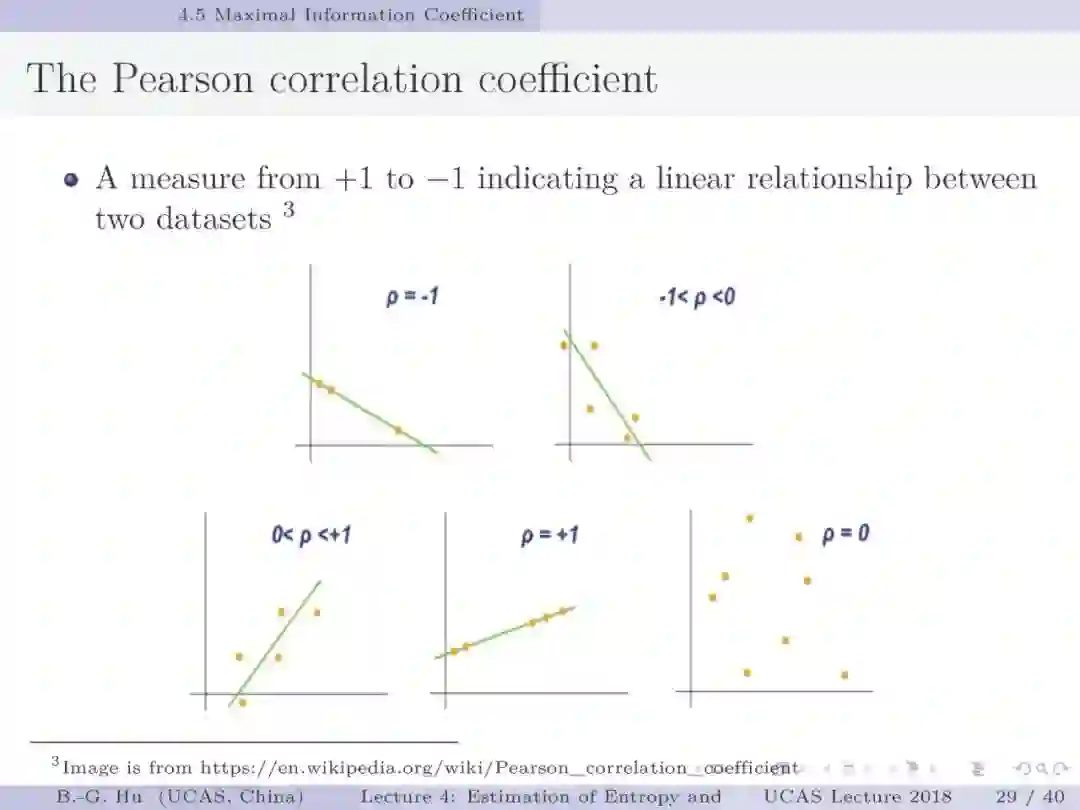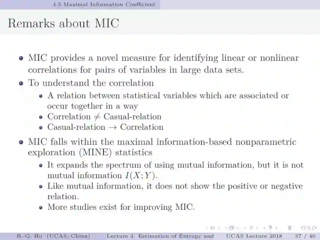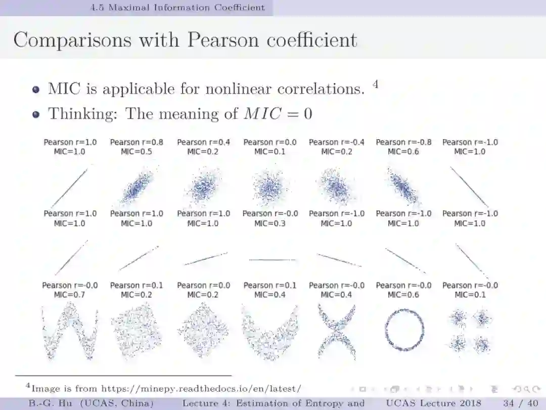 第30-37页: 我认为MIC方法给出了信息论中互信息定义扩展应用与估计方法创新的典型样例。他们首先发现现有指标应用中的问题,然后提出基于信息论为基础思想的指标,再后对这个指标提出需求满足两个启发式属性。这是一种顶层的先验知识。我们将其称为“元准则”,即关于准则之上的准则。最后是发展了具体MIC方法并从数据实验中表明该方法是基本符合两个启发式属性。希望读者能够从从这个研究样例中“悟”出一种个人总结的方法论?