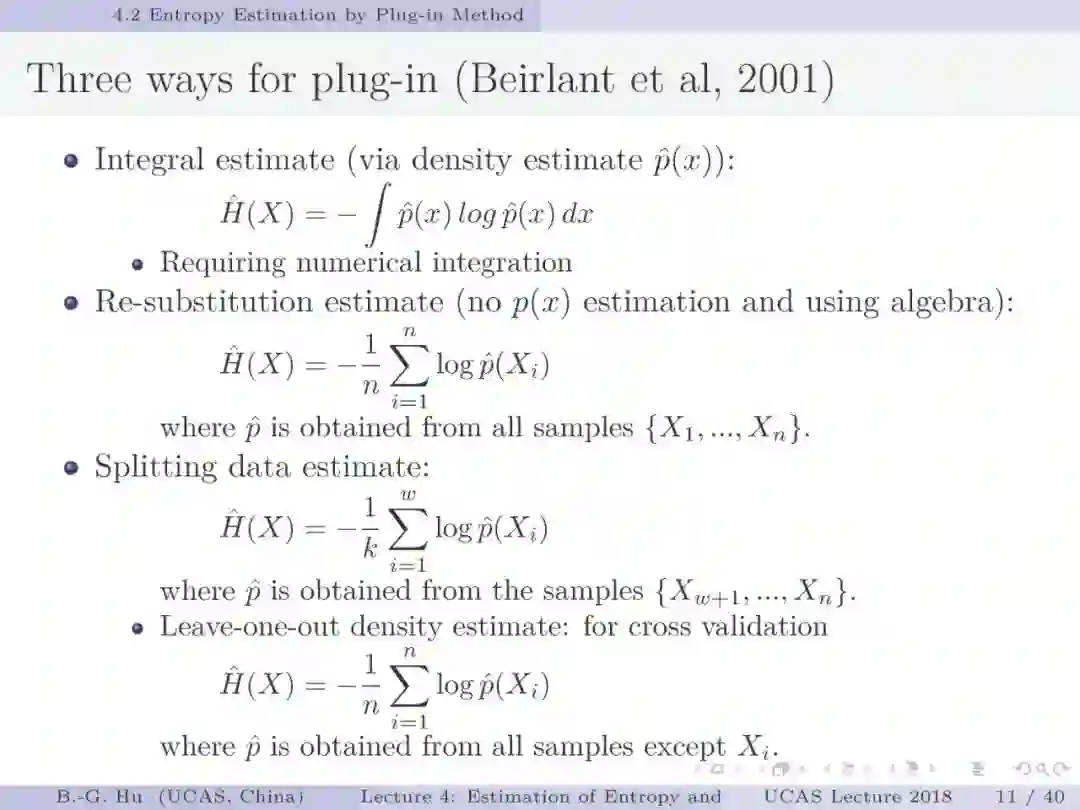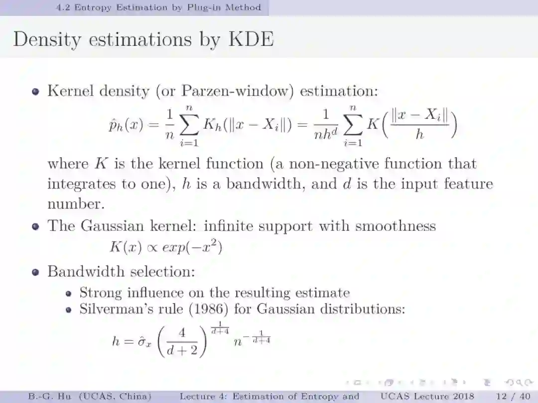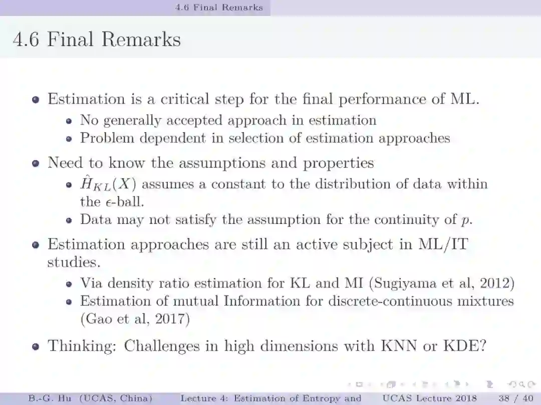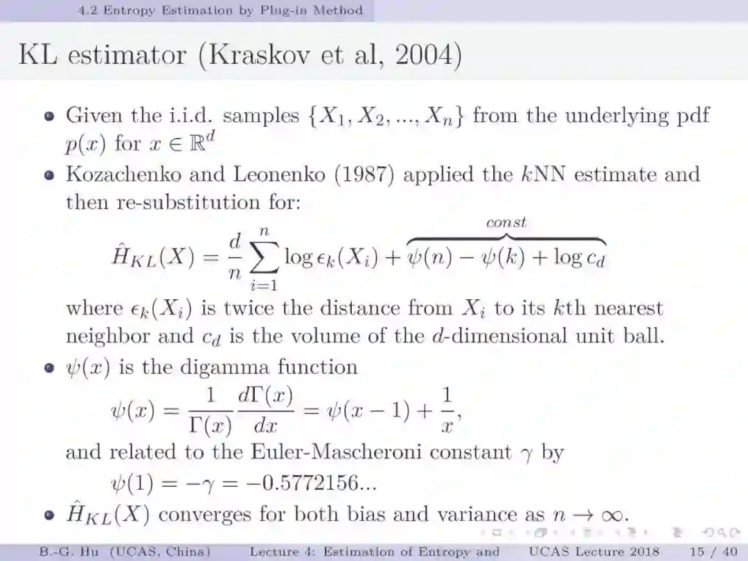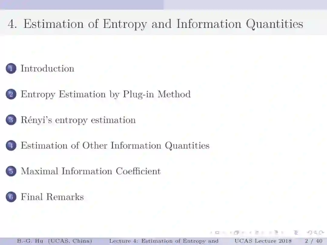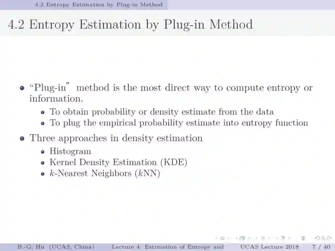 【导读】在信息论或机器学习教学中,通常不包含熵估计内容。由于现代通讯应用中是数字通讯,对于离散随机变量,熵估计方法成熟,因此不是问题。而在机器学习或大数据处理中,大量数据是以连续随机变量方式出现(如图像、语音等)。而对连续随机变量及其混合随机变量,目前熵估计仍然处于方法研究发展阶段。机器学习传统教学中会包括分布估计,而不包括熵估计内容。我们知道熵估计类似于随机变量分布估计,需求大量且在低维数据中方可获得较好的近似解。熵估计或分布估计均属于“生成式(discriminative)学习”,一般会比“判别式(generative)学习”更难于处理,且预测结果误差更大。熵估计可以被认为是信息论与机器学习“综合”中的最大障碍。而这些障碍有些是本质性的,比如高维数据情况下的维数灾难(Curse of Dimensionality)问题。当估计结果很差时,基于信息论机器学习方法将不可能有效。比如对同样一组数据,应用不同估计方法或不同内部参数会有很大不同结果。因此可以认为基于信息论机器学习中,熵与其它信息量估计是关键性的基础问题。因此本教学中,增加该章为独立内容。我们认为对抗网络(GAN)中的“生成式”方法结合“判别式”方法是赋予智能机器进化功能中的重要学习方式,其中信息论会扮演重要角色(想想为什么)。该章是讲解熵与其它信息量估计这样基础问题与必要知识,由此也可理解为什么近年来这个主题研究开始活跃起来。