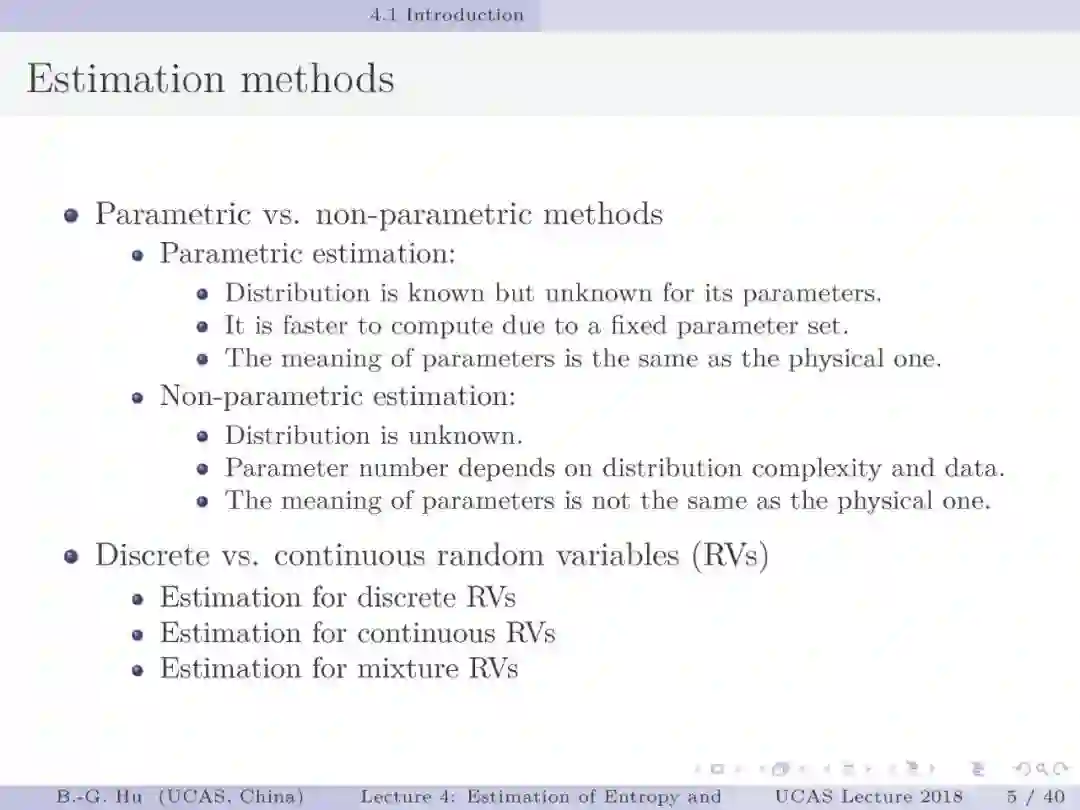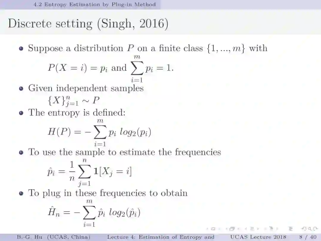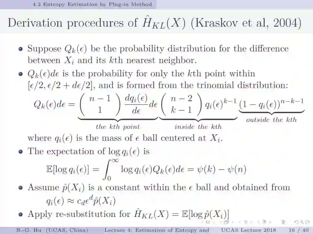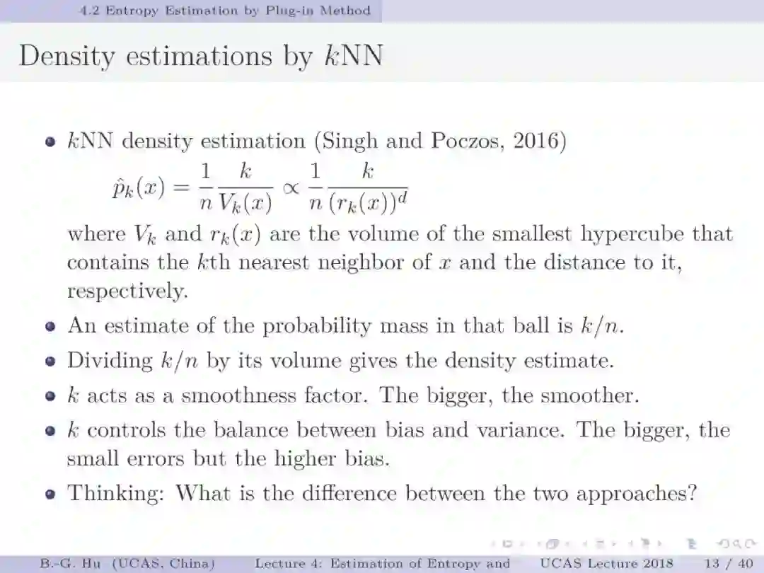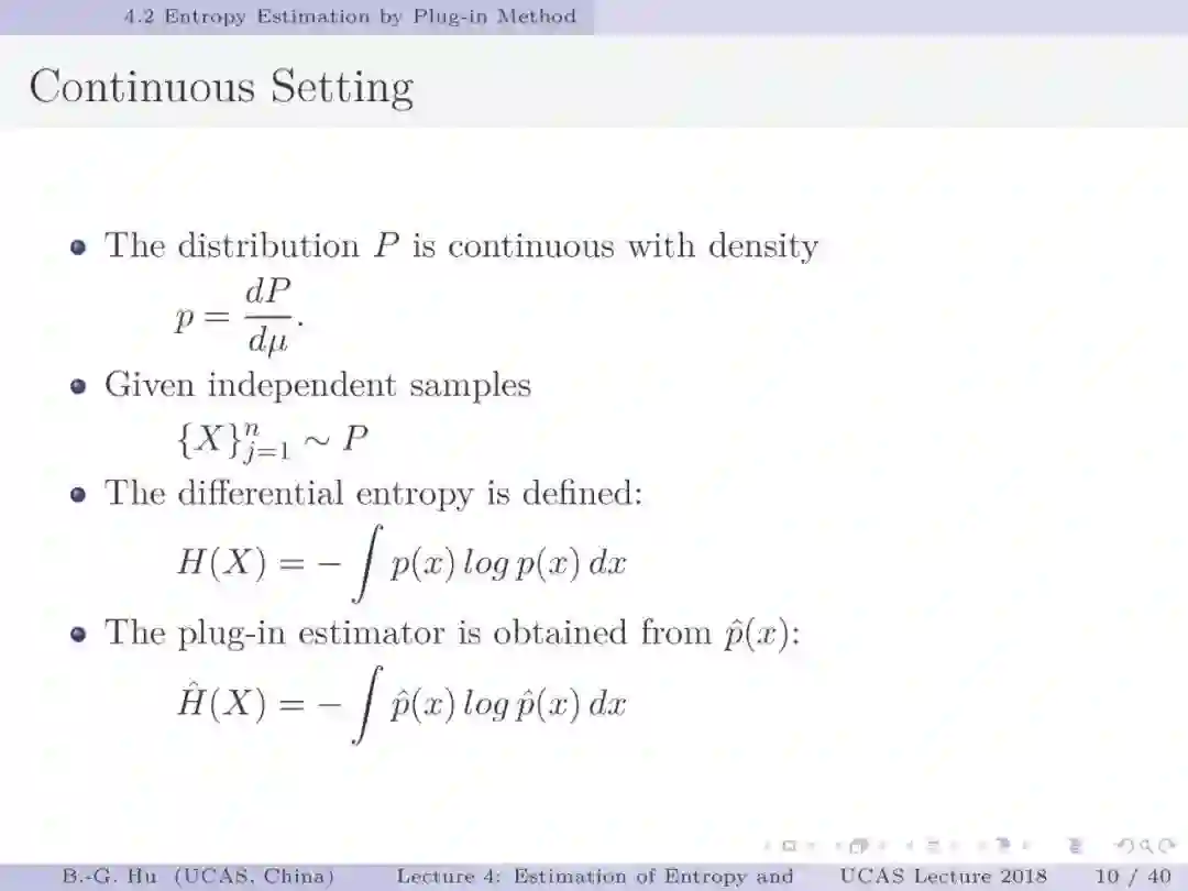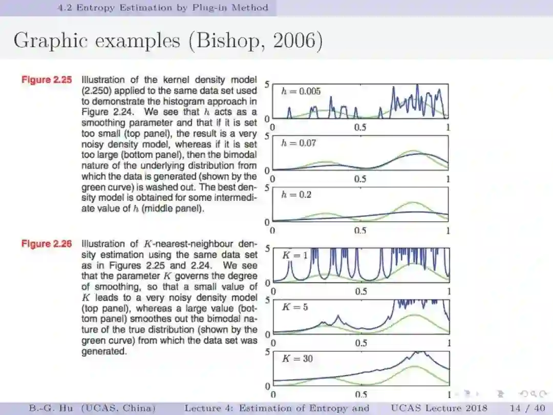 【导读】在信息论或机器学习教学中,通常不包含熵估计内容。由于现代通讯应用中是数字通讯,对于离散随机变量,熵估计方法成熟,因此不是问题。而在机器学习或大数据处理中,大量数据是以连续随机变量方式出现(如图像、语音等)。而对连续随机变量及其混合随机变量,目前熵估计仍然处于方法研究发展阶段。机器学习传统教学中会包括分布估计,而不包括熵估计内容。我们知道熵估计类似于随机变量分布估计,需求大量且在低维数据中方可获得较好的近似解。熵估计或分布估计均属于“生成式(discriminative)学习”,一般会比“判别式(generative)学习”更难于处理,且预测结果误差更大。熵估计可以被认为是信息论与机器学习“综合”中的最大障碍。而这些障碍有些是本质性的,比如高维数据情况下的维数灾难(Curse of Dimensionality)问题。当估计结果很差时,基于信息论机器学习方法将不可能有效。比如对同样一组数据,应用不同估计方法或不同内部参数会有很大不同结果。因此可以认为基于信息论机器学习中,熵与其它信息量估计是关键性的基础问题。因此本教学中,增加该章为独立内容。我们认为对抗网络(GAN)中的“生成式”方法结合“判别式”方法是赋予智能机器进化功能中的重要学习方式,其中信息论会扮演重要角色(想想为什么)。该章是讲解熵与其它信息量估计这样基础问题与必要知识,由此也可理解为什么近年来这个主题研究开始活跃起来。