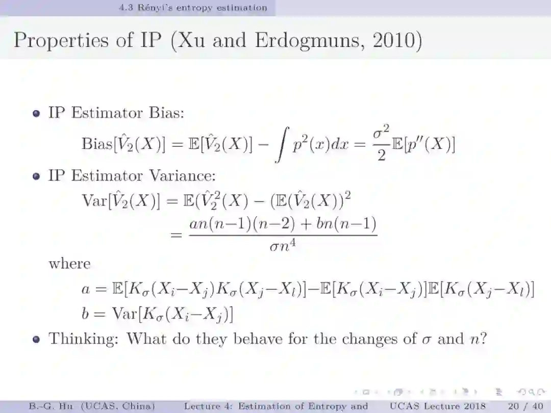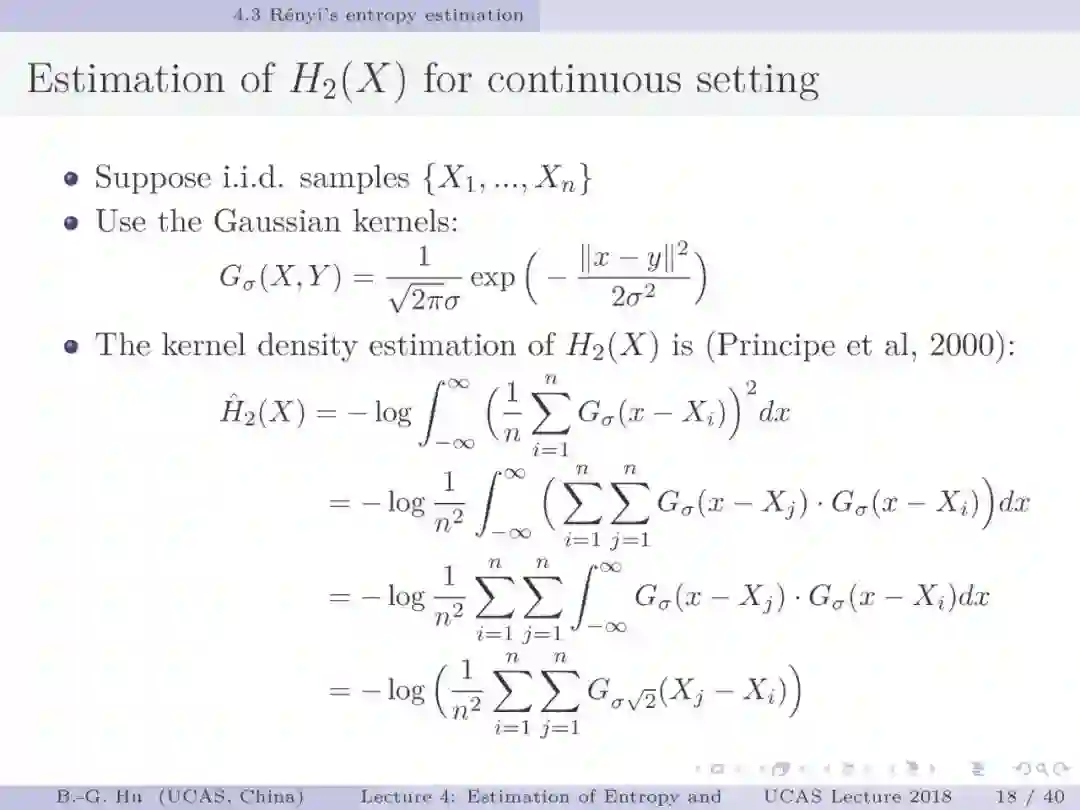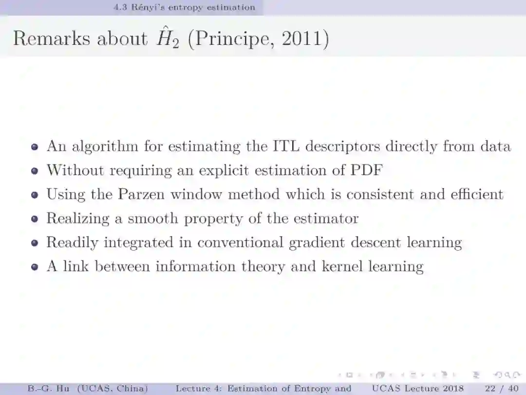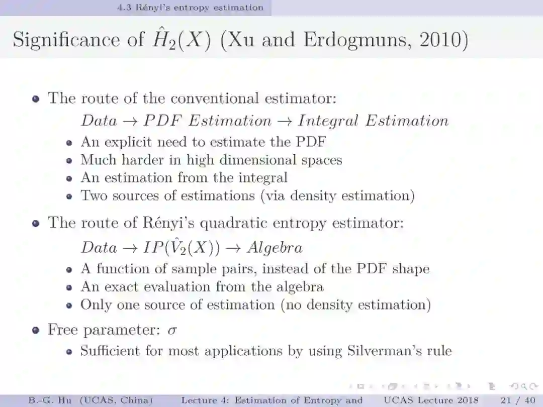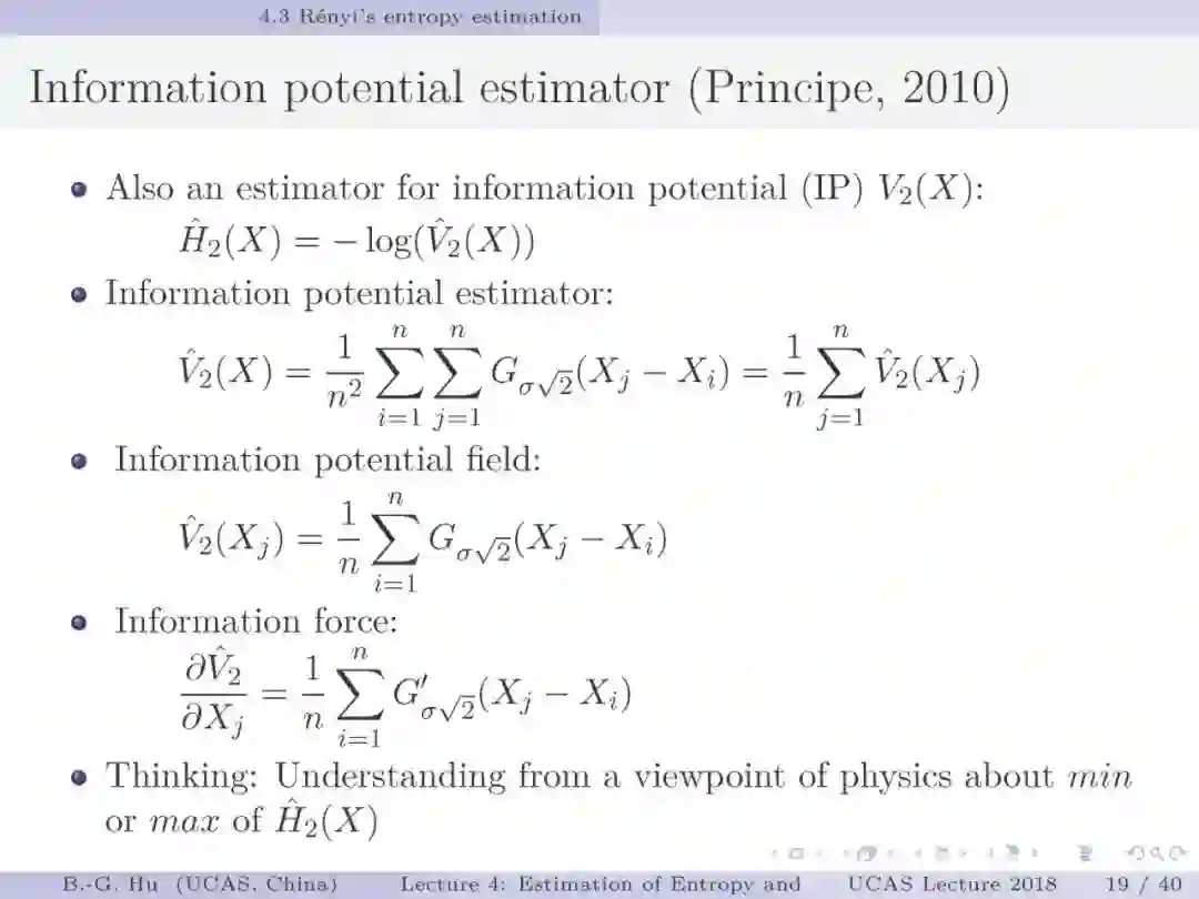 第17-22页: 在第一章中我们介绍了美国佛罗里达大学Principe教授是国际上首次提出“信息论机器学习(ITL)”理论框架的学者。基于此框架他们团队发展了许多基础性的原创工作。这里主要是他们关于二次Renyi熵中的部分贡献。其中从物理视角提出信息势、信息势场、信息力的定义(第19页),并与二次Renyi熵建立关联的学术思想十分重要并具启迪性。本人理解这是对机器学习从信息论角度提供解释性的重要基础。其中给我的启迪是未来研究要打通机器学习、信息论、物理原理之间的关联。第22页中的要点也可以理解为熵估计方法中期望的性质。