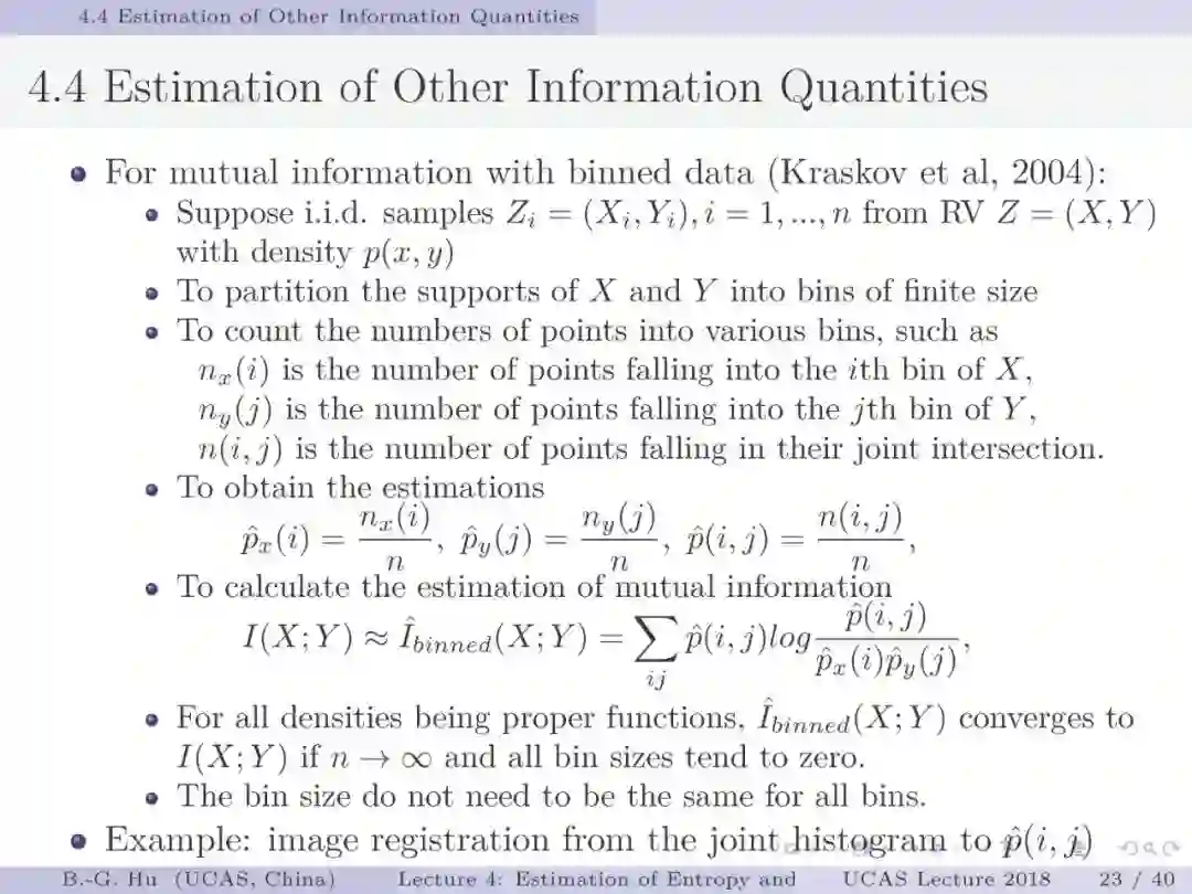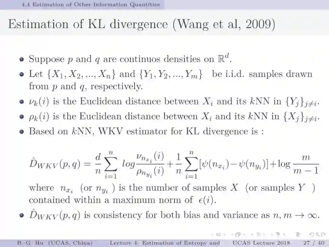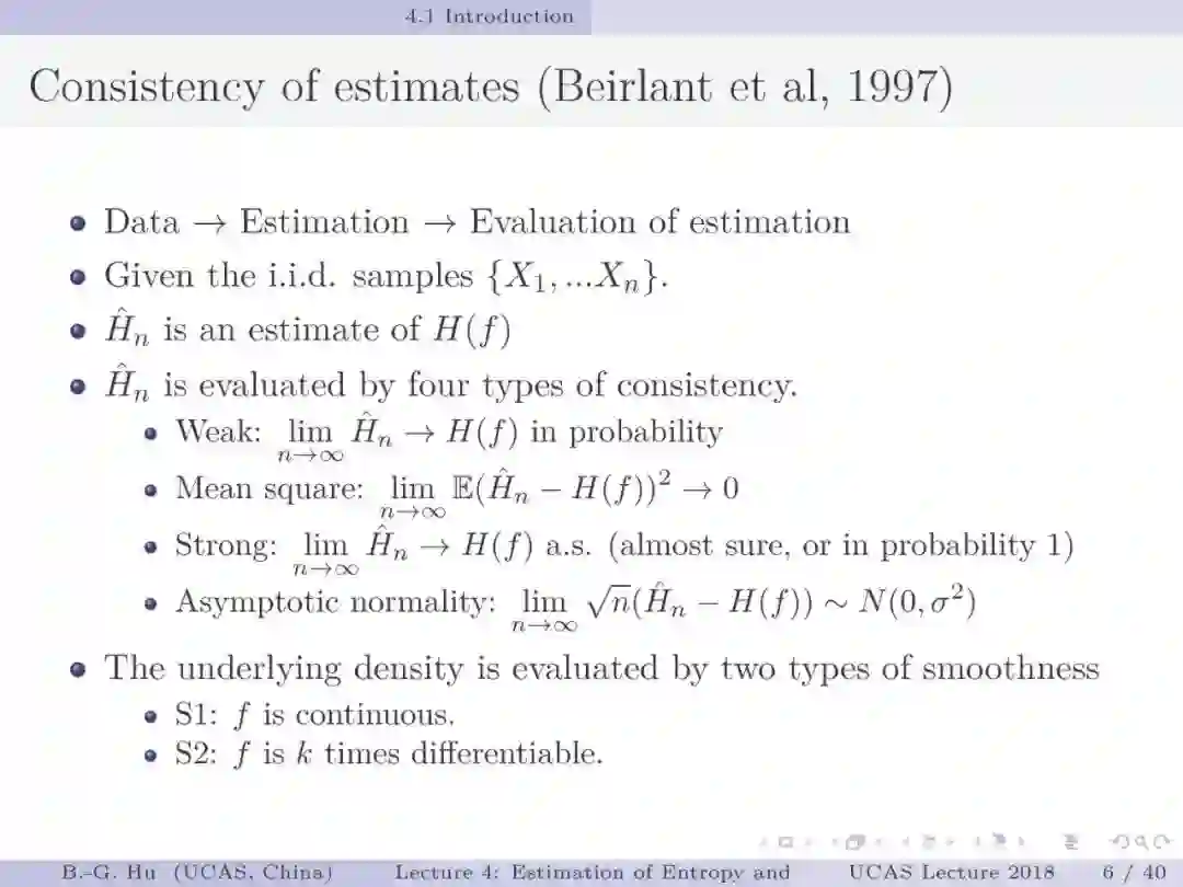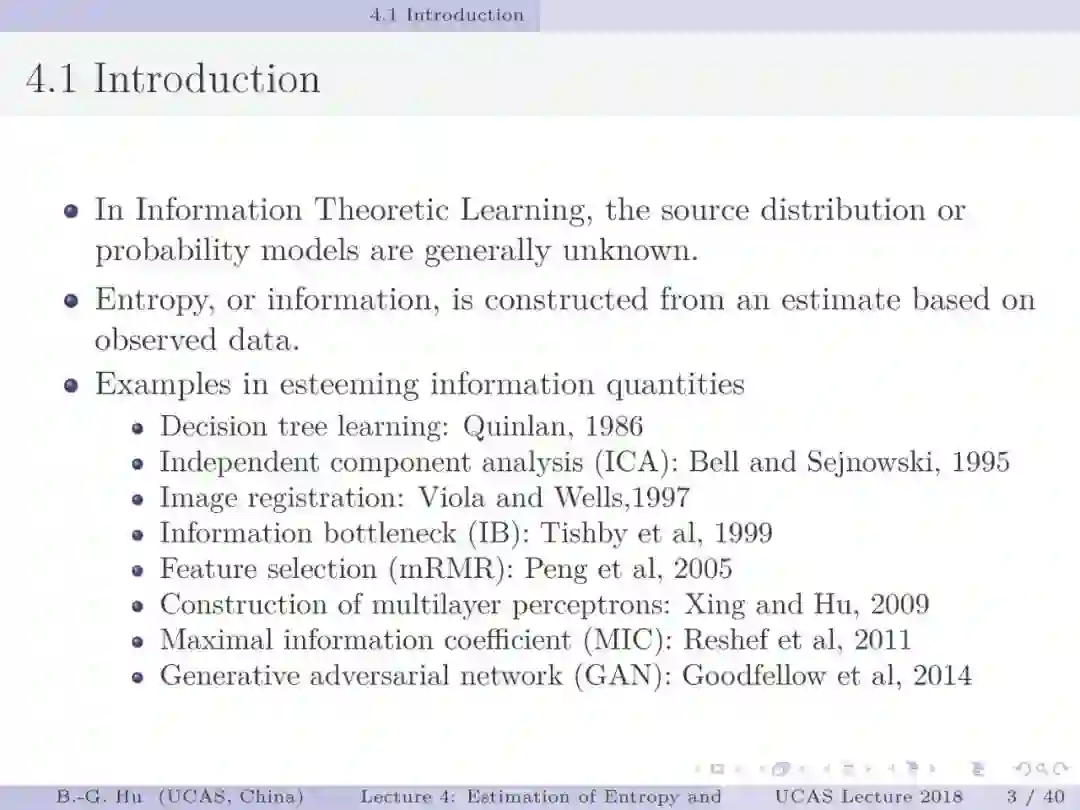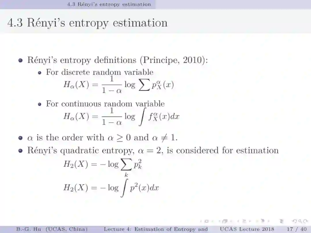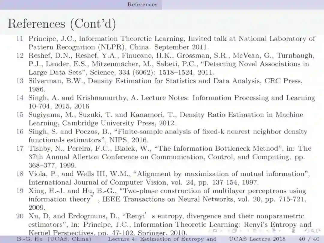 第17-22页: 在第一章中我们介绍了美国佛罗里达大学Principe教授是国际上首次提出“信息论机器学习(ITL)”理论框架的学者。基于此框架他们团队发展了许多基础性的原创工作。这里主要是他们关于二次Renyi熵中的部分贡献。其中从物理视角提出信息势、信息势场、信息力的定义(第19页),并与二次Renyi熵建立关联的学术思想十分重要并具启迪性。本人理解这是对机器学习从信息论角度提供解释性的重要基础。其中给我的启迪是未来研究要打通机器学习、信息论、物理原理之间的关联。第22页中的要点也可以理解为熵估计方法中期望的性质。