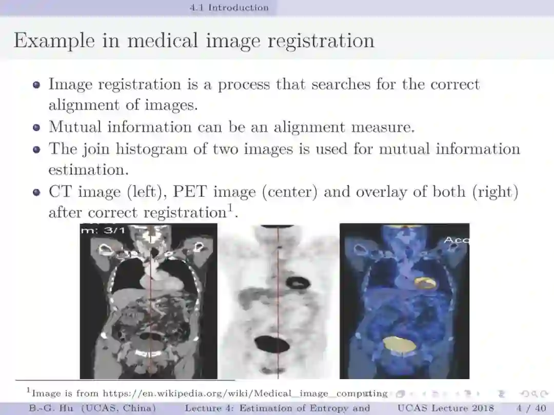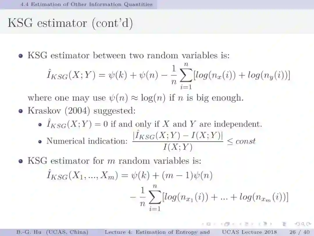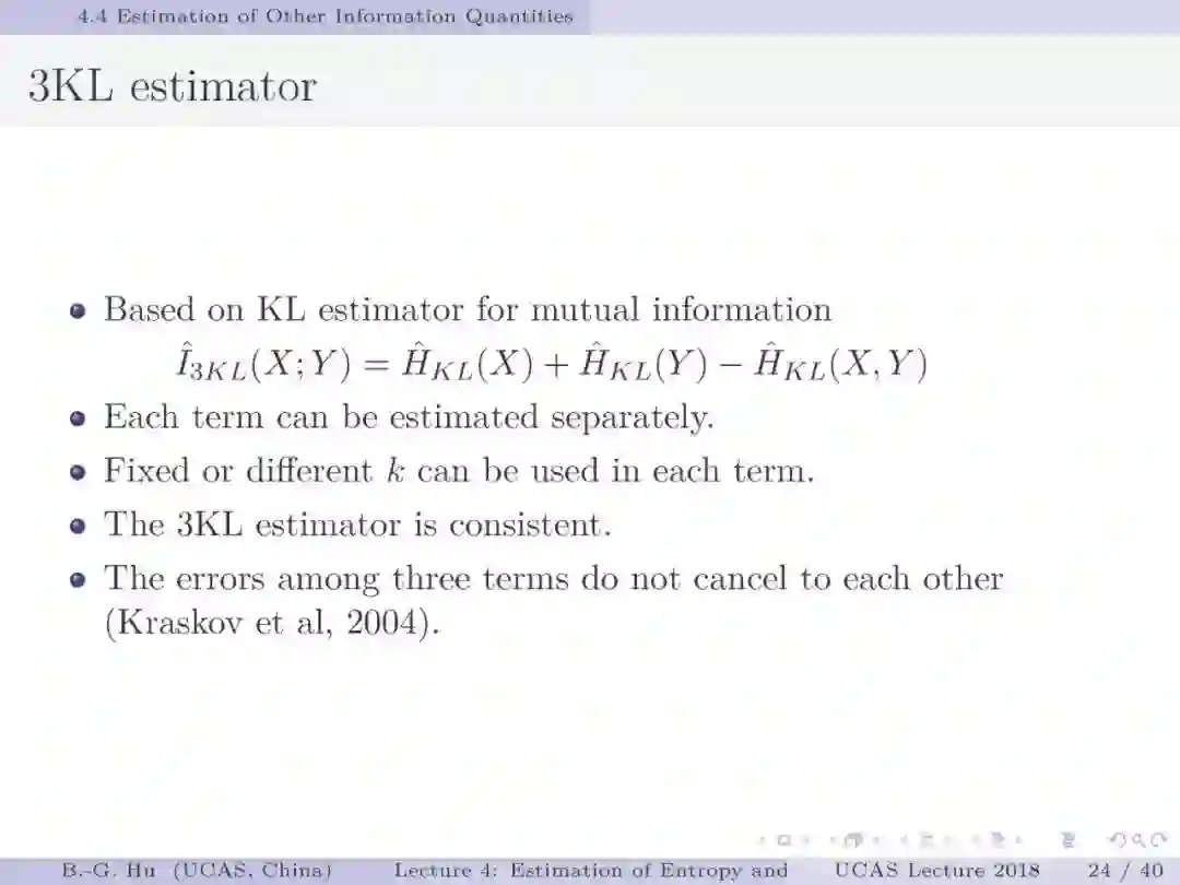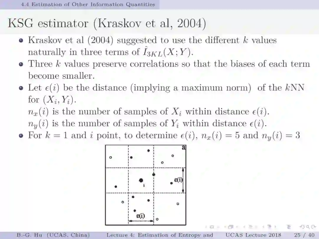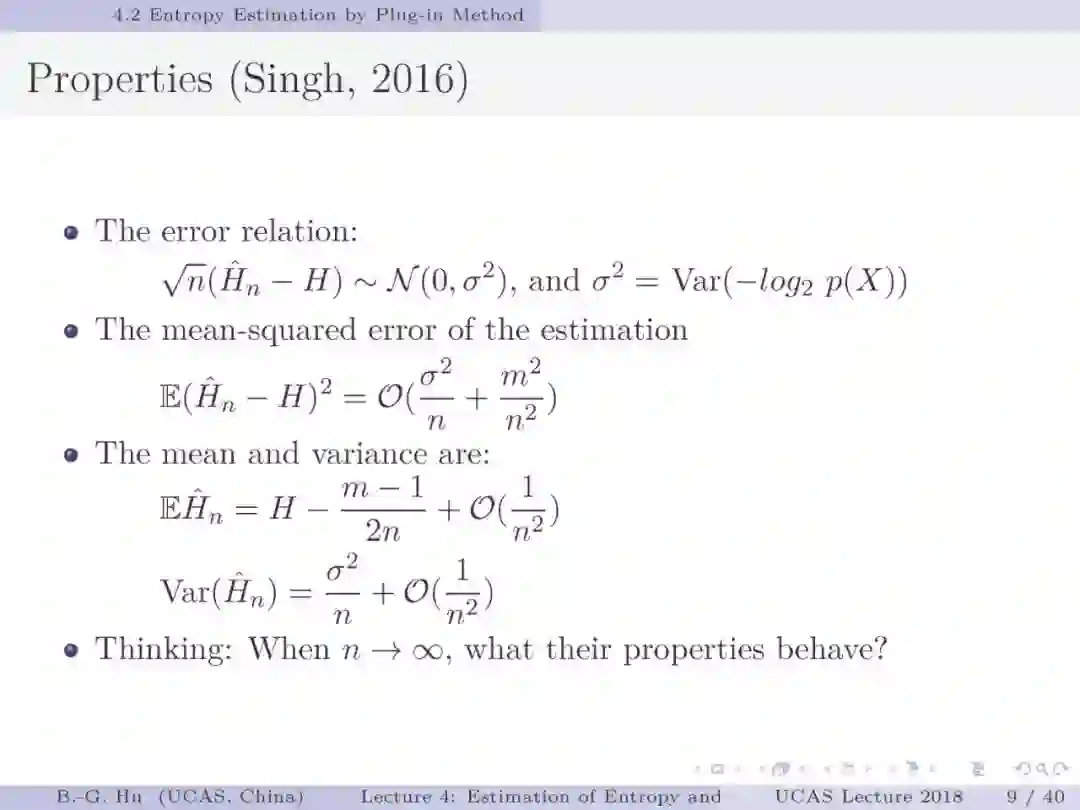 第17-22页: 在第一章中我们介绍了美国佛罗里达大学Principe教授是国际上首次提出“信息论机器学习(ITL)”理论框架的学者。基于此框架他们团队发展了许多基础性的原创工作。这里主要是他们关于二次Renyi熵中的部分贡献。其中从物理视角提出信息势、信息势场、信息力的定义(第19页),并与二次Renyi熵建立关联的学术思想十分重要并具启迪性。本人理解这是对机器学习从信息论角度提供解释性的重要基础。其中给我的启迪是未来研究要打通机器学习、信息论、物理原理之间的关联。第22页中的要点也可以理解为熵估计方法中期望的性质。