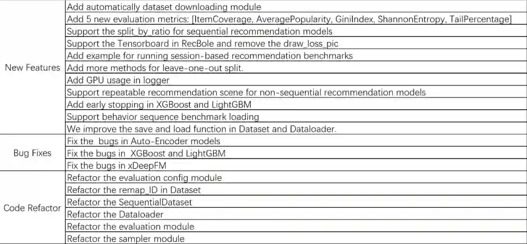 | Evaluation | 全排序评测和采样评测流程独立,用户无法添加客制化指标,评测加速逻辑存在局限性。 | 统一了全排序评测和采样评测流程,支持用户客制化的指标开发并添加了non-accuracy的评测指标,优化了加速逻辑。 |