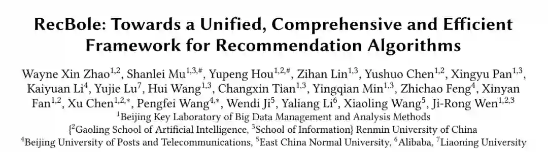 [1]Wayne Xin Zhao, Shanlei Mu, Yupeng Hou, Zihan Lin, Kaiyuan Li, Yushuo Chen,Yujie Lu, Hui Wang, Changxin Tian, Xingyu Pan, Yingqian Min, Zhichao Feng,Xinyan Fan, Xu Chen, Pengfei Wang, Wendi Ji, Yaliang Li, Xiaoling Wang, andJi-Rong Wen. 2020. RecBole: Towards a Unified, Comprehensive and Efficient Framework for Recommendation Algorithms. arXiv preprint arXiv:2011.01731(2020).