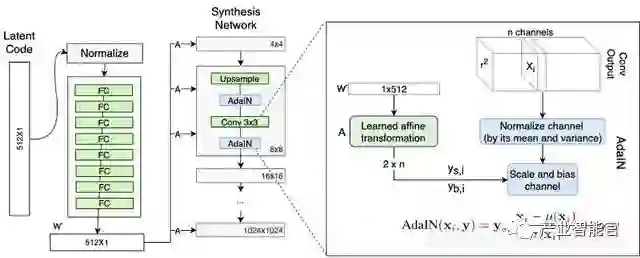 AdaIN(自适应实例标准化)模块将映射网络创建的编码信息ⱳ传输到生成的图像中。该模块被添加到合成网络的每个分辨率级别中,并定义该级别中特征的可视化表达式: